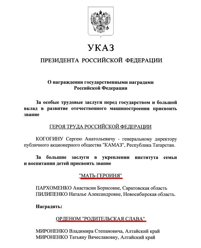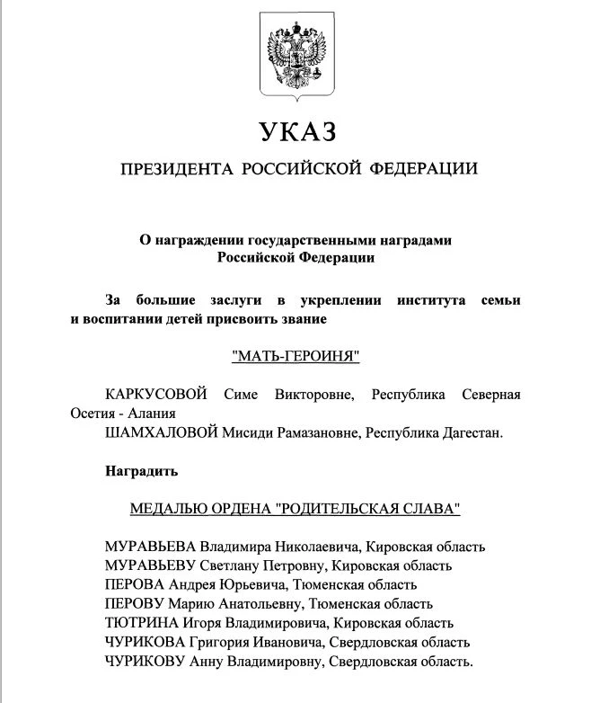 Владимир Путин 10 декабря 2025 года подписал указ о награждении многодетных семей страны почётными государственными наградами: