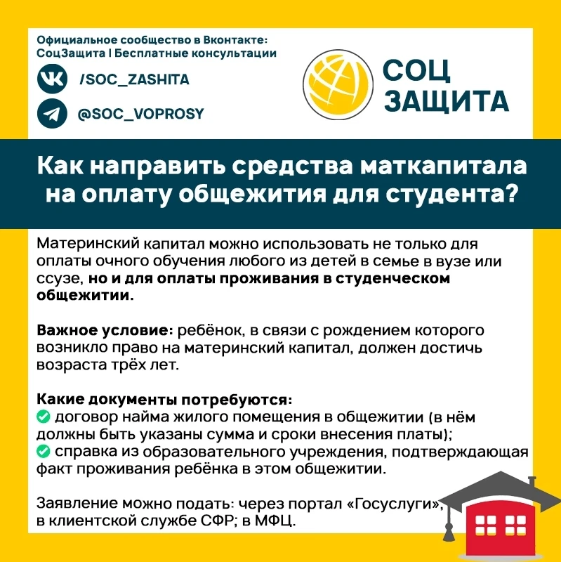 Как потратить маткапитал на общежитие для студента?