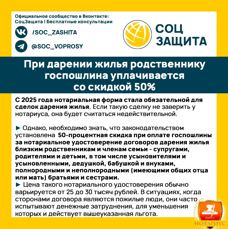 Необходимо знать, что при дарении жилья родственнику госпошлина уплачивается со скидкой 50%.