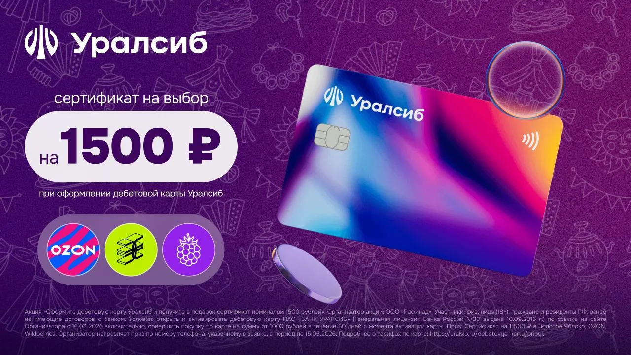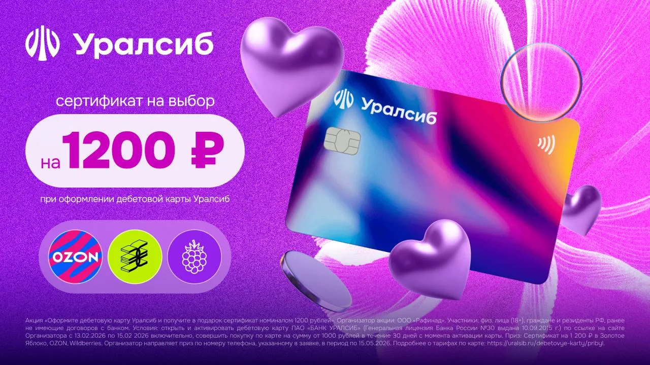 Только 13–15 февраля — дебетовая карта “Прибыль” Уралсиб + сетификат 1200₽ в Золотое Яблоко, Ozon или Wildberries!