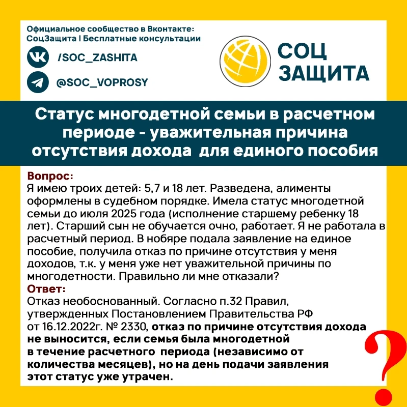 Статус многодетной семьи в расчетном периоде - уважительная причина отсутствия дохода для единого пособия.