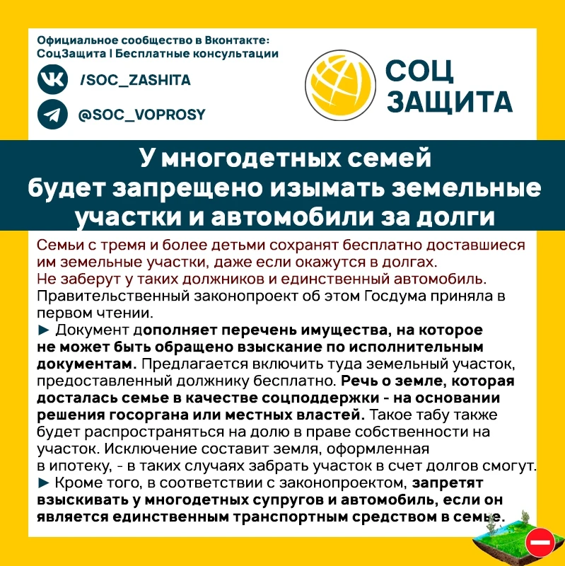 ⚡️ У многодетных семей будет запрещено изымать земельные участки и автомобили за долги.