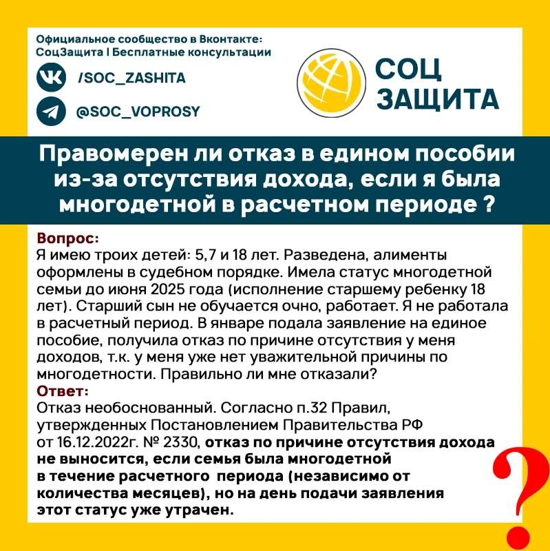 Почему мне отказали в едином пособии из-за отсутствия дохода, хотя в расчётном периоде я имела статус многодетной матери?