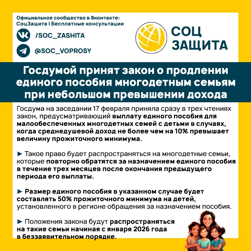 Госдумой принят закон о продлении единого пособия многодетным семьям при небольшом превышении дохода.