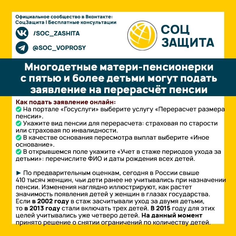 Многодетные матери-пенсионерки с пятью и более детьми уже могут подать заявление на перерасчёт пенсии.