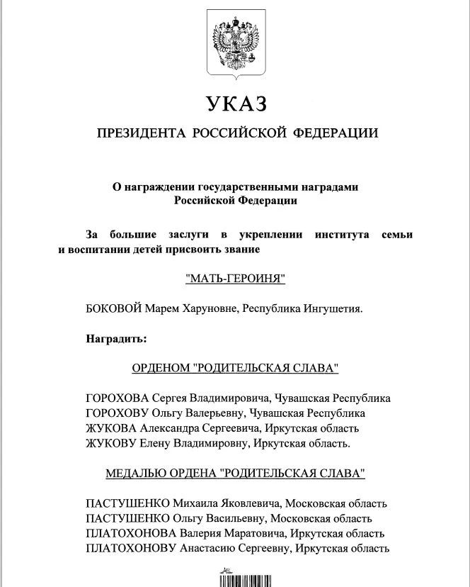 Президент РФ 14 февраля 2026 года подписал указ о награждении многодетных семей страны почётными государственными наградами: