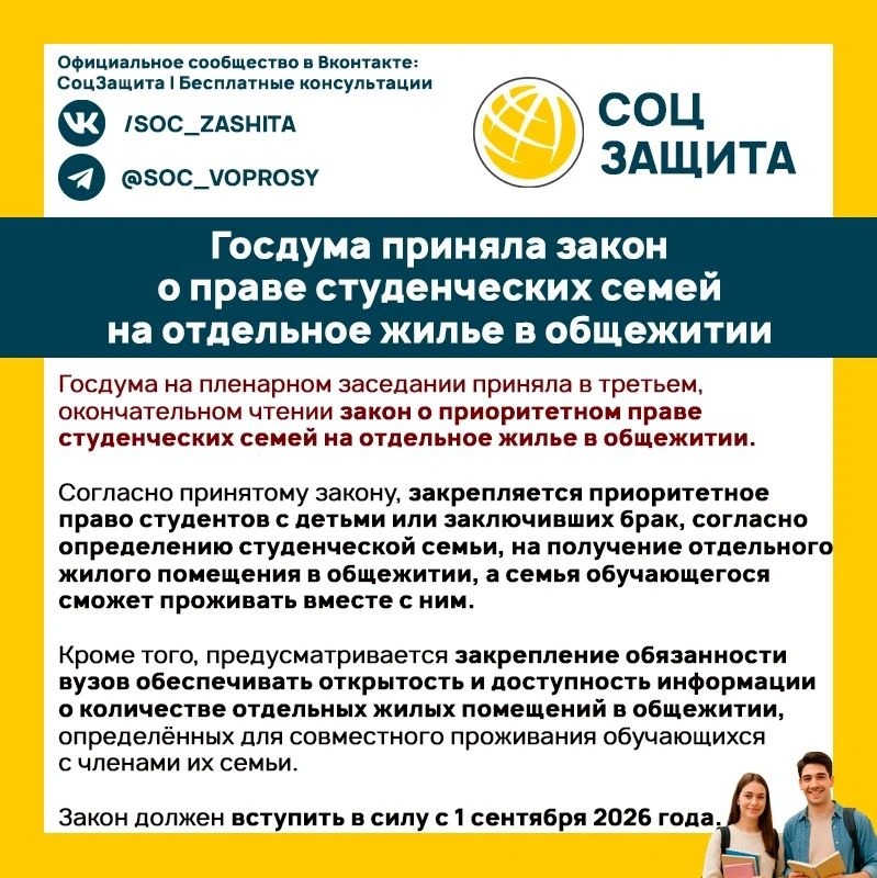 Госдума приняла закон о праве студенческих семей на отдельное жилье в общежитии.