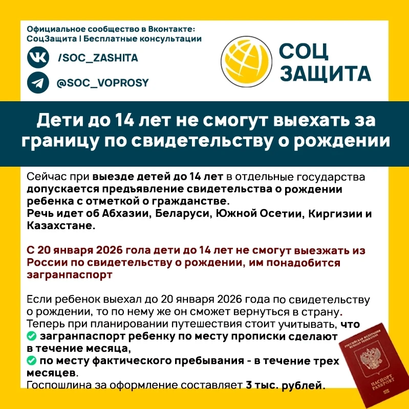 Для международных поездок детям до 14 лет требуется загранпаспорт — свидетельства о рождении недостаточно.