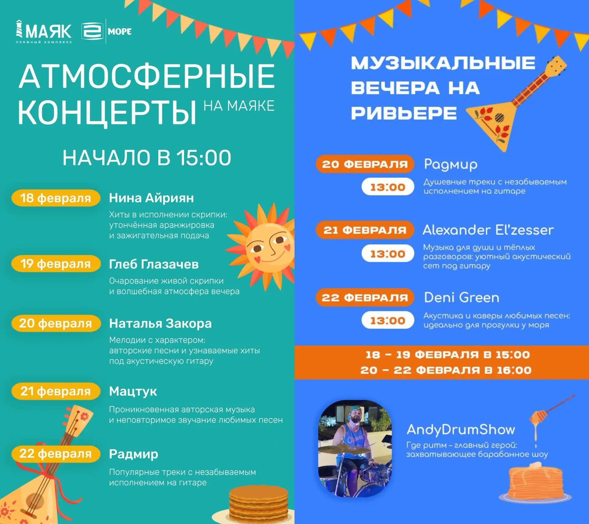 С 18 по 22 февраля пляжи «Маяк» и «Ривьера» наполняются звуками музыки, ароматом горячего чая и ощущением настоящего праздника у моря.