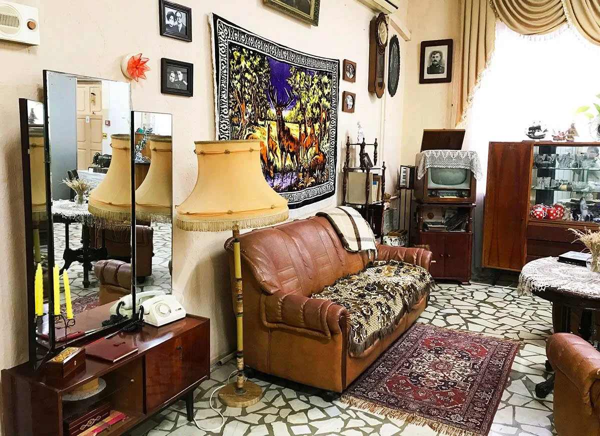 Здесь всё как в обычной советской семье: сервант с хрусталём, телевизор “Беларусь-3”, стационарный телефон, ковёр на стене и тот самый уют, который помнят многие с детства. На тумбочках газеты и журналы, на полках книги, а рядом часы, радиоприёмник и аккуратные статуэтки. Всё настоящее, с историей и характером.