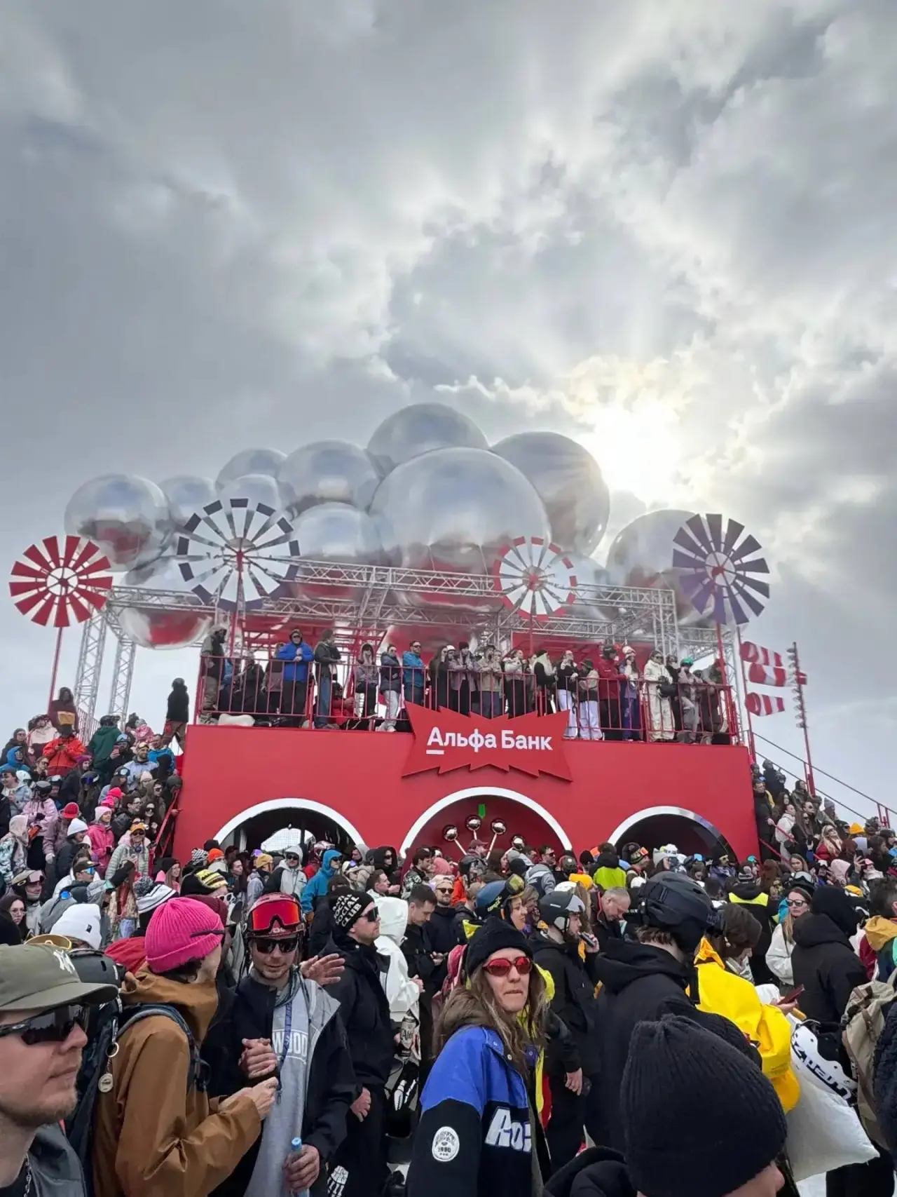 Толпа людей собралась на высоте 1600 метров на New Star Camp — фестивале спорта и музыки, который на этой неделе идёт на Розе Хутор.