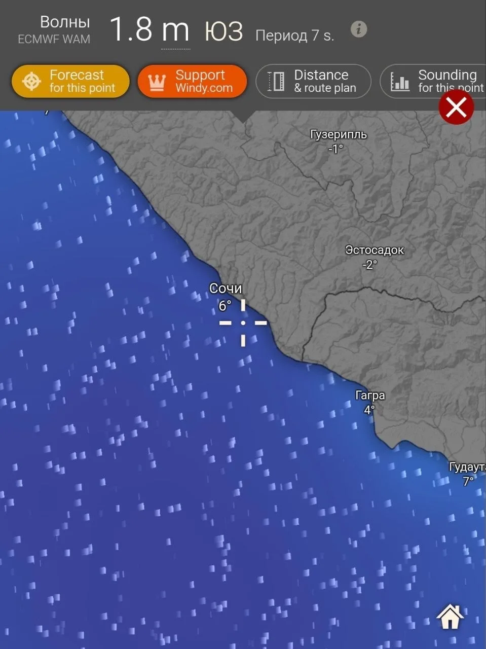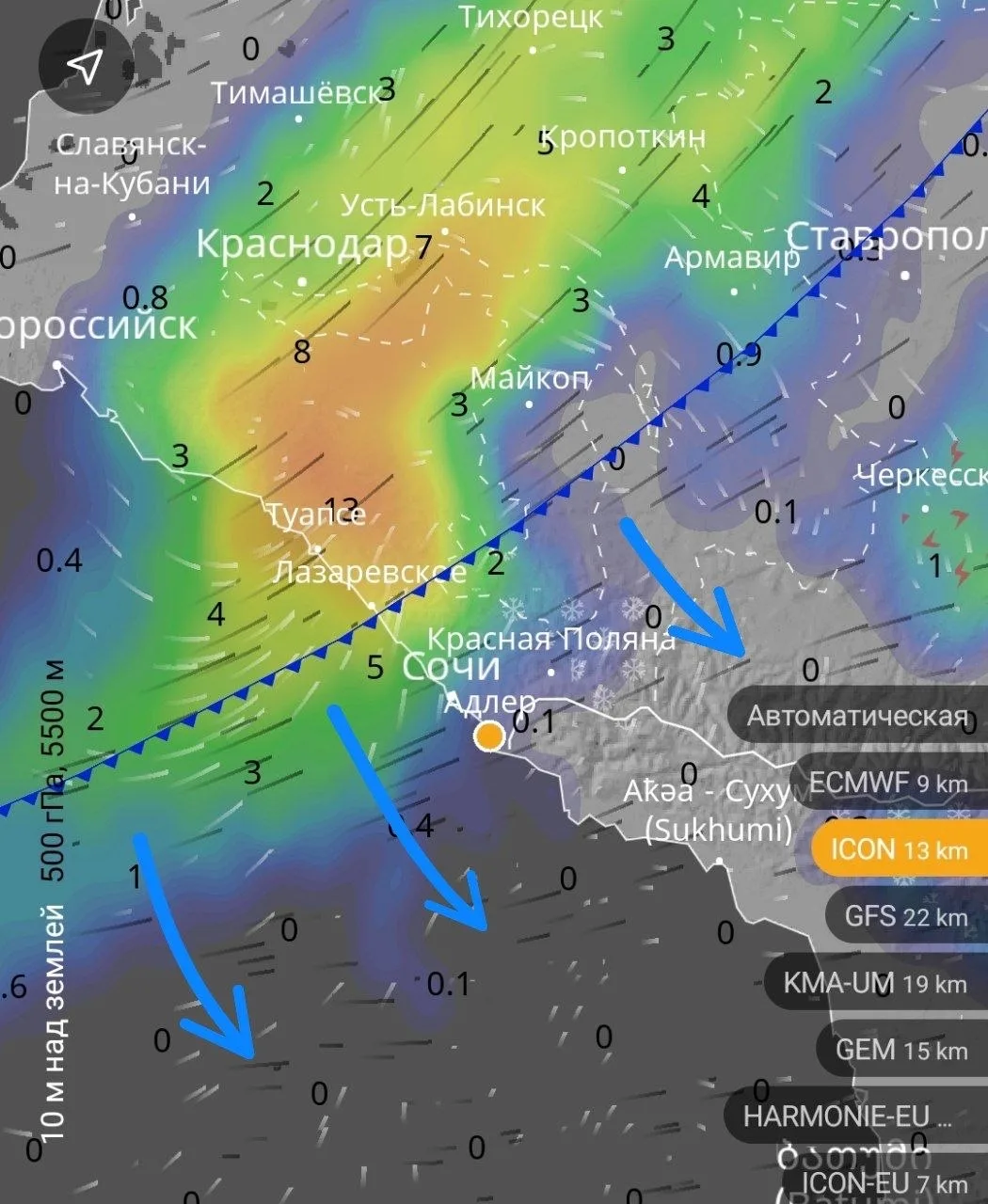 Завтра во второй половине дня вдоль побережья с большой скоростью начнет сдвигаться холодный фронт. Прогнозируют сильные дожди и усиление ветра до 15-17 м/с вдоль побережья, в горах Сочи до 28 м/с. А в четверг ожидается 5-бальный шторм на море с волнами до 1.8 - 2.0 метра