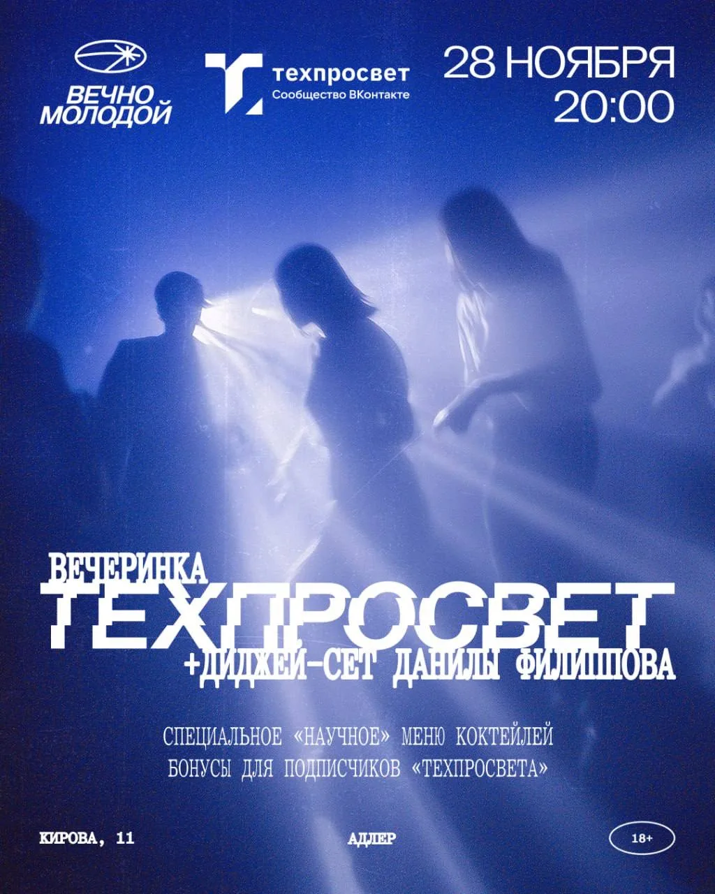 28 ноября бар «Вечно молодой» и сообщество Техпросвет ВКонтакте приглашают всех на главную вечеринку Конгресса молодых ученых 2025.