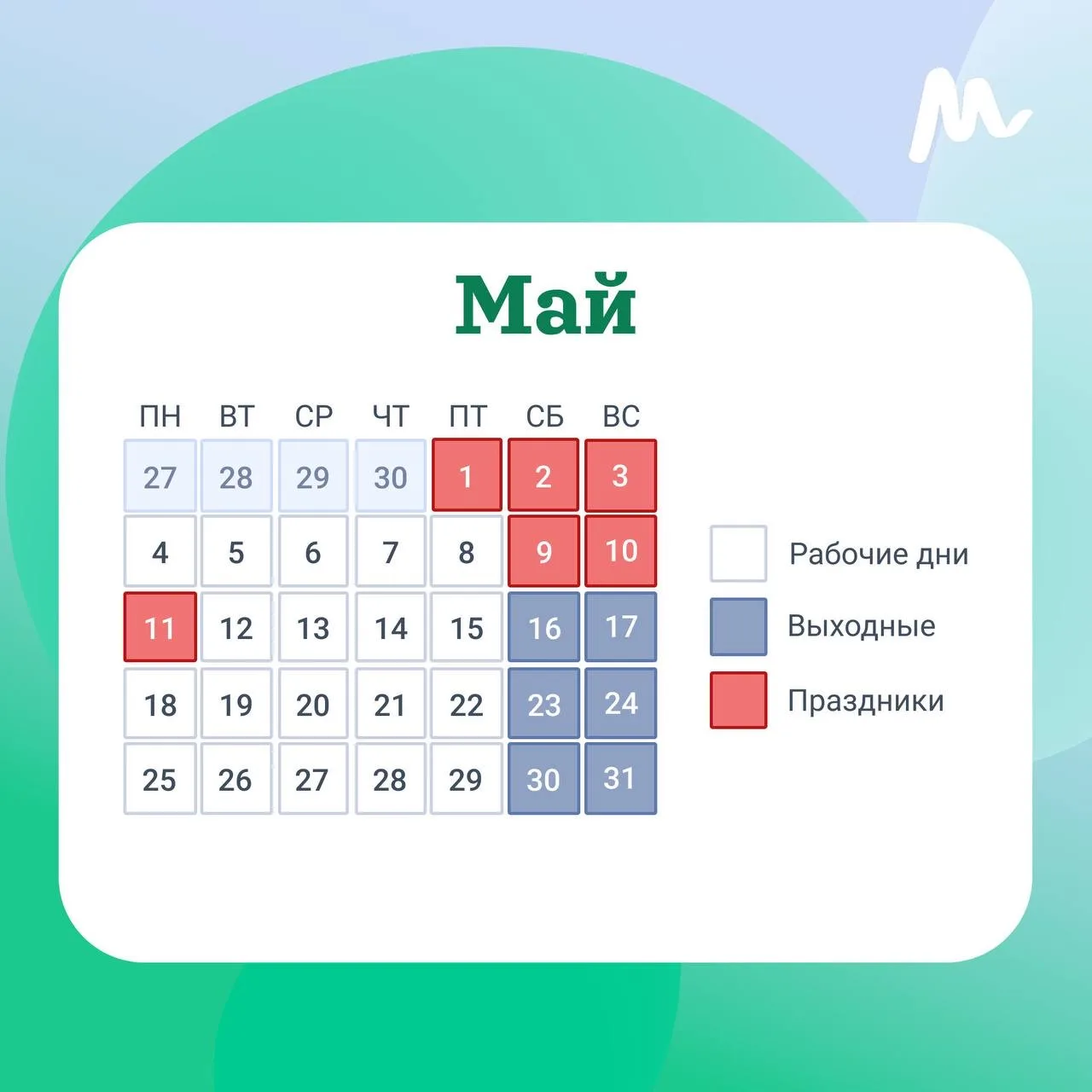 Помимо суббот и воскресений, отдохнём с 1 по 3 мая — Праздник Весны и Труда, с 9 по 11 мая — День Победы. Работать будем всего 19 дней.
