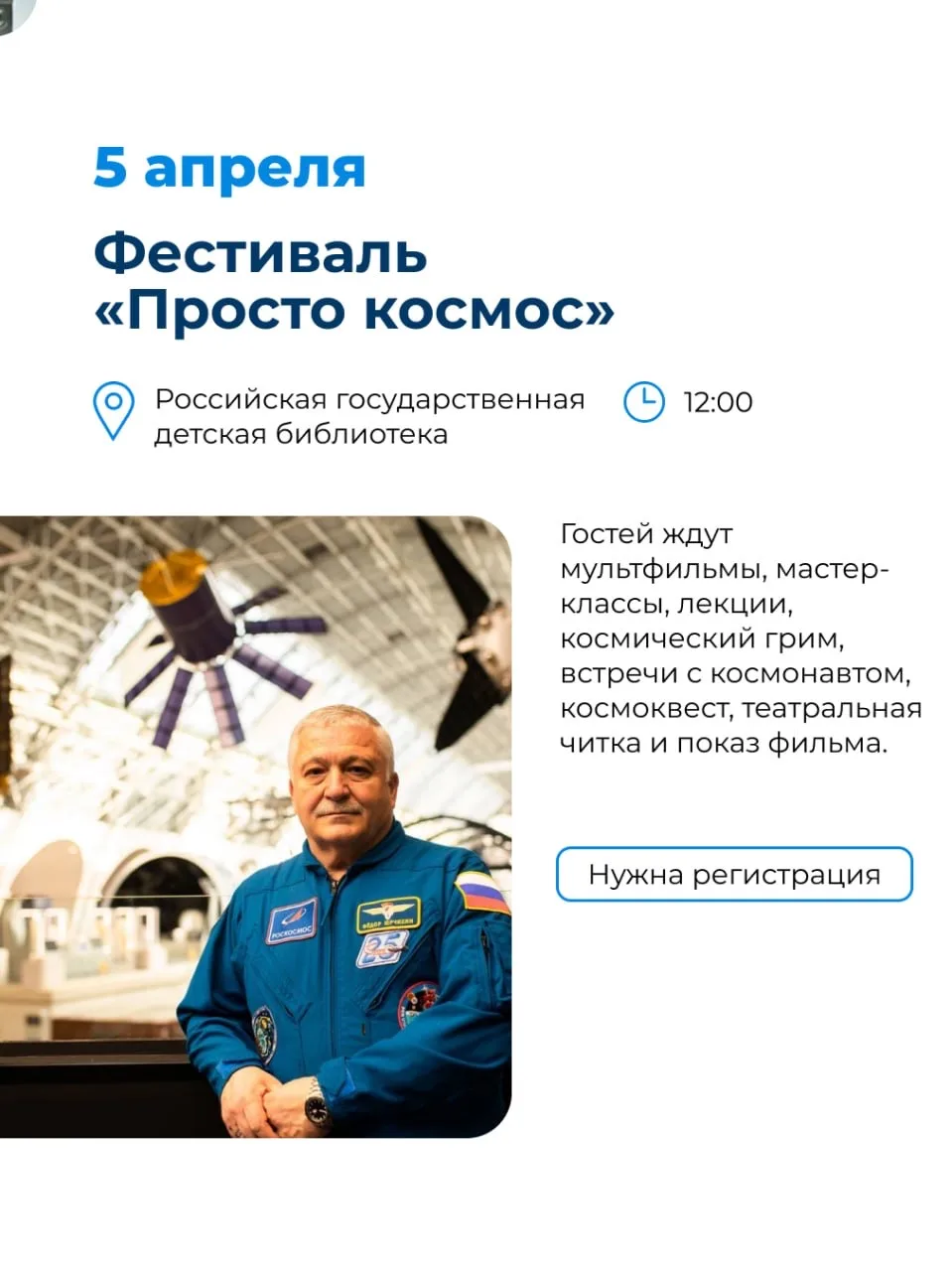 🚀 Жителей и гостей столицы приглашают на встречи с космонавтами, выставки, экскурсии и другие активности. Всего подготовили более 450 мероприятий!