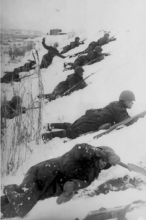 6 декабря 1943 года. СССР. Бойцы Красной армии Ленинградского фронта на тактических учениях на рубеже накапливания перед атакой.