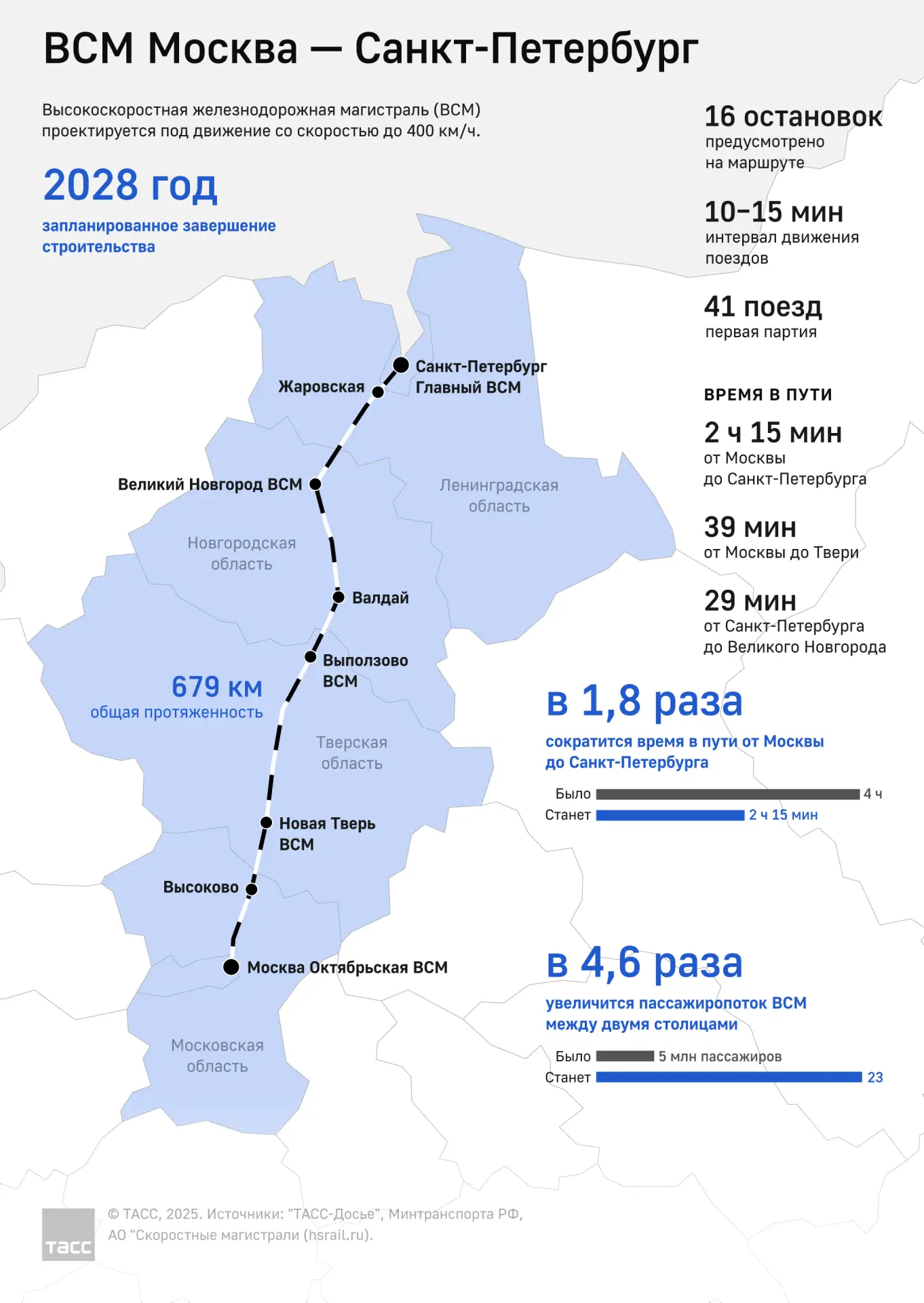 Реализация проекта строительства первой в РФ высокоскоростной железнодорожной магистрали Москва - Санкт-Петербург ведется по поручению президента России Владимира Путина в рамках национального проекта "Эффективная транспортная система".