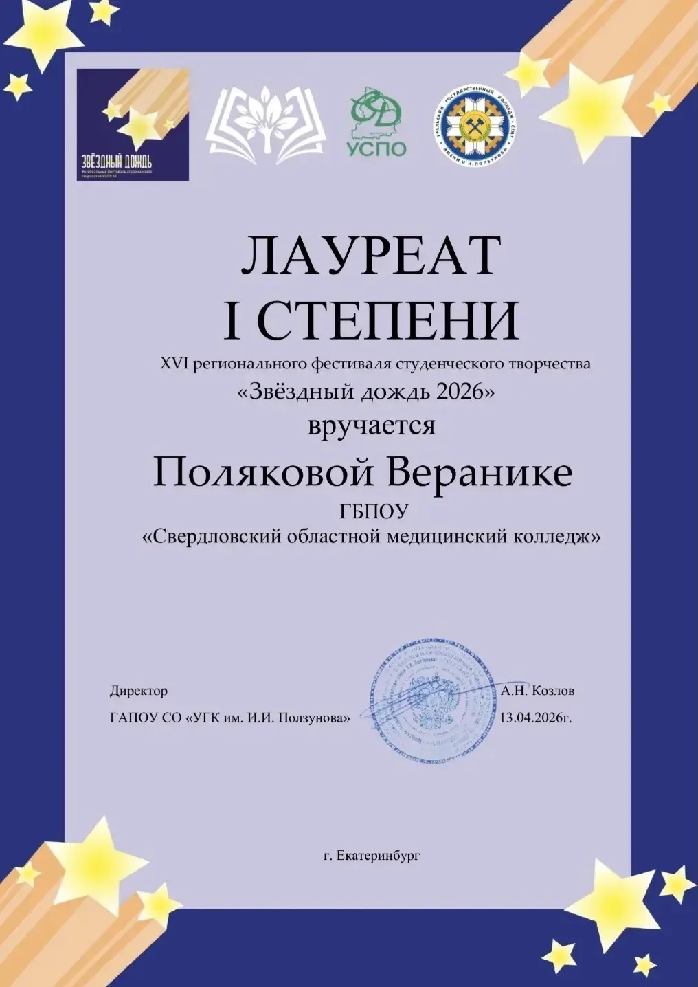 - Лауреат I степени — Полякова Вероника Евгеньевна.