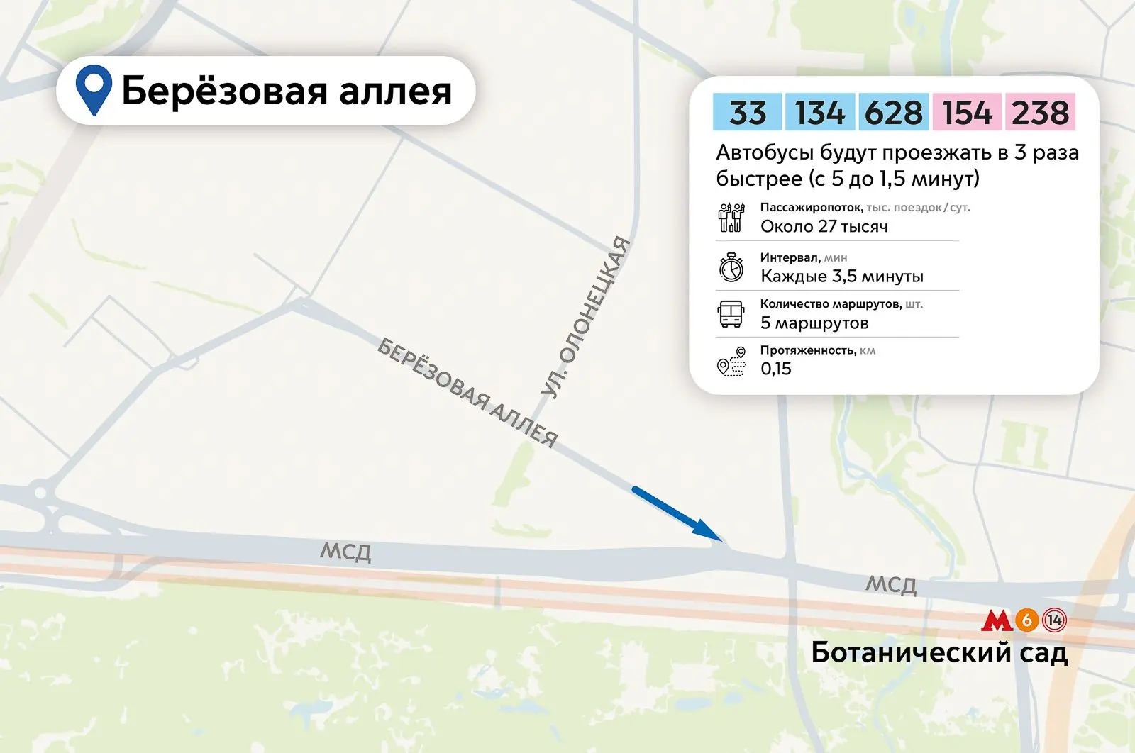 ↔️ Березовая аллея (в районе Московского скоростного диаметра) — автобусы смогут проезжать участок за 1,5 минуты вместо 5, что ускорит движение в три раза.
