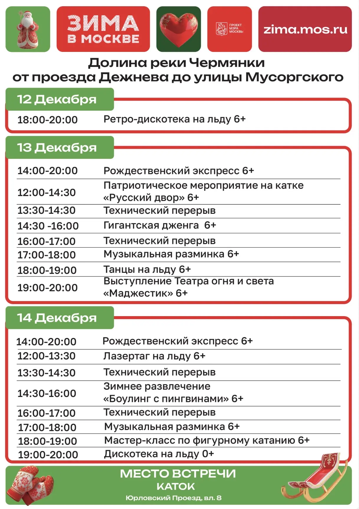 Юрловский пр-д, вл. 8. Площадь — более 1000 м². Работает бесплатно, прокат коньков платный (400 ₽/час в будни, 500 ₽/час в выходные). Открыт ежедневно с 10:00 до 22:00. Официальное открытие — 5 декабря в 19:00 с «Шоу световых барабанов».