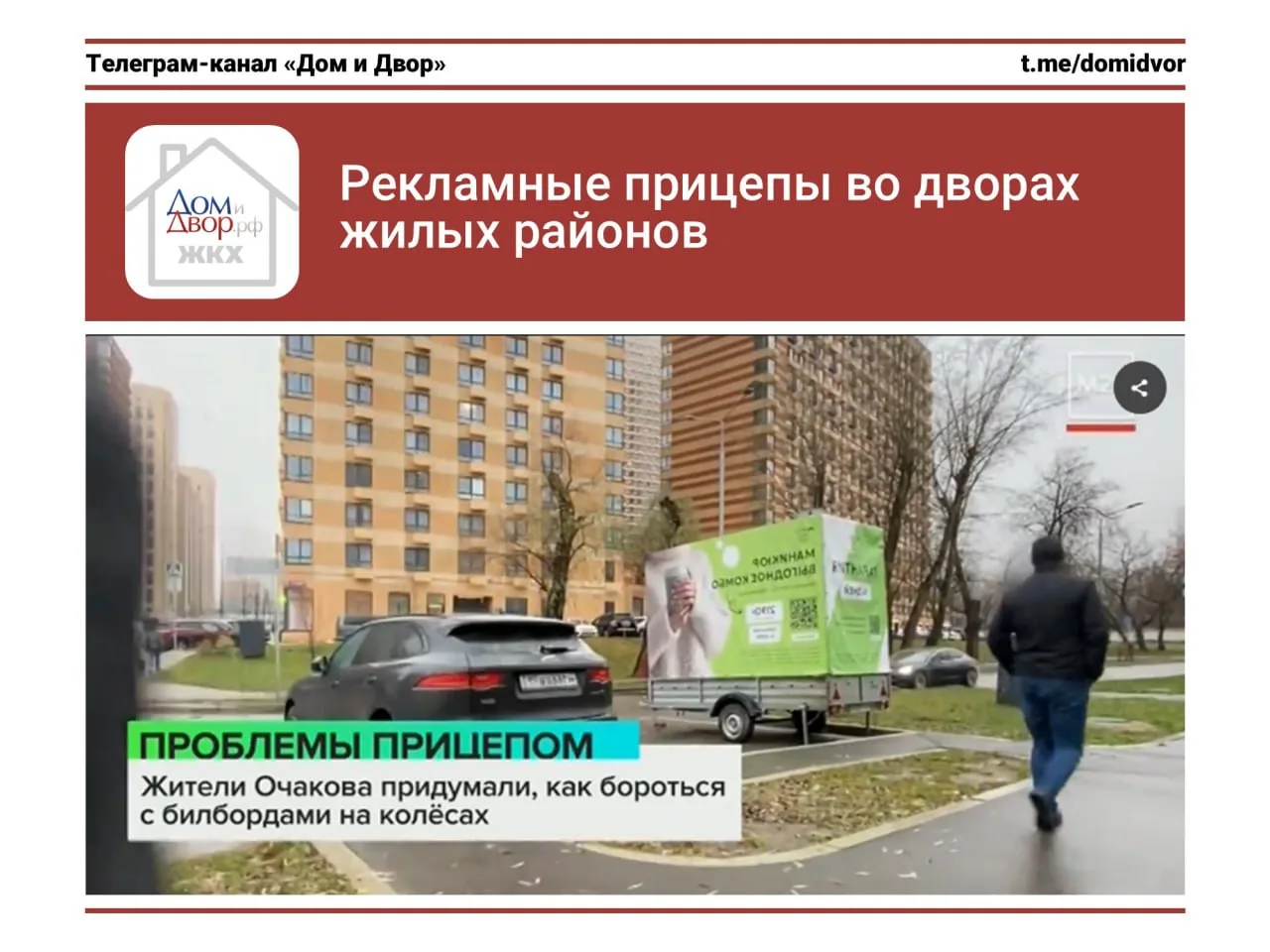 На телеканале «Москва 24» подняли проблему размещения автомобильных прицепов с рекламой на парковочных местах во дворах. Жители одного из домов столкнулись с тем, что место на придомовой территории занял прицеп с рекламой нового фитнес-клуба.