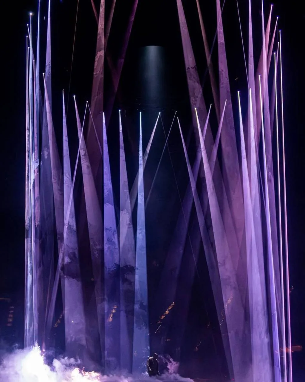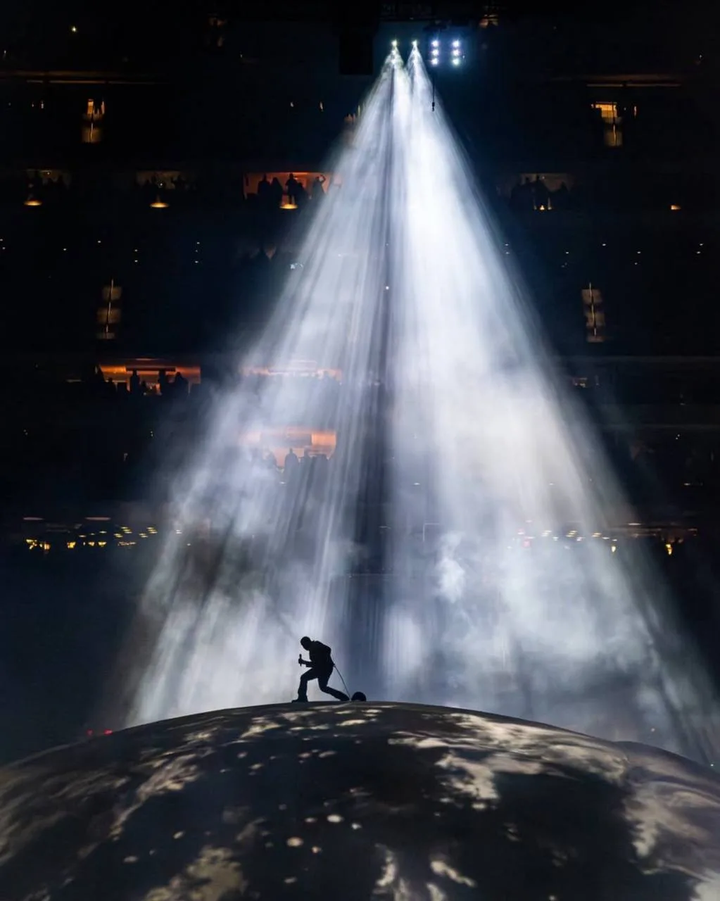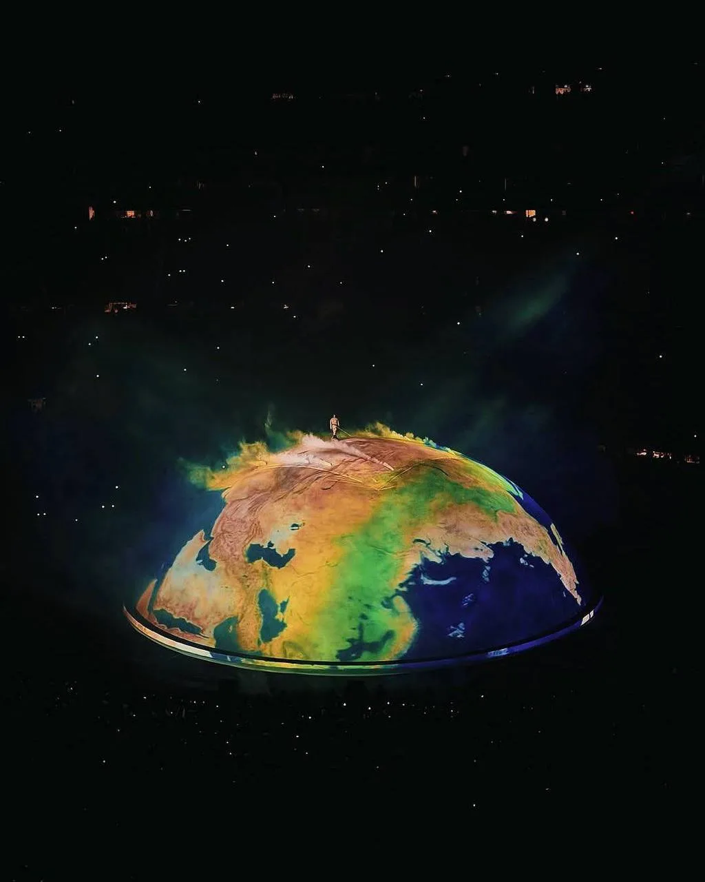 В центре образовалась гигантская полусфера, которая по ходу выступления превращалась то в планету, то в какую-то дымную абстракцию. Выглядело это, как отличное продолжение его текущего хаотичного мироощущения.