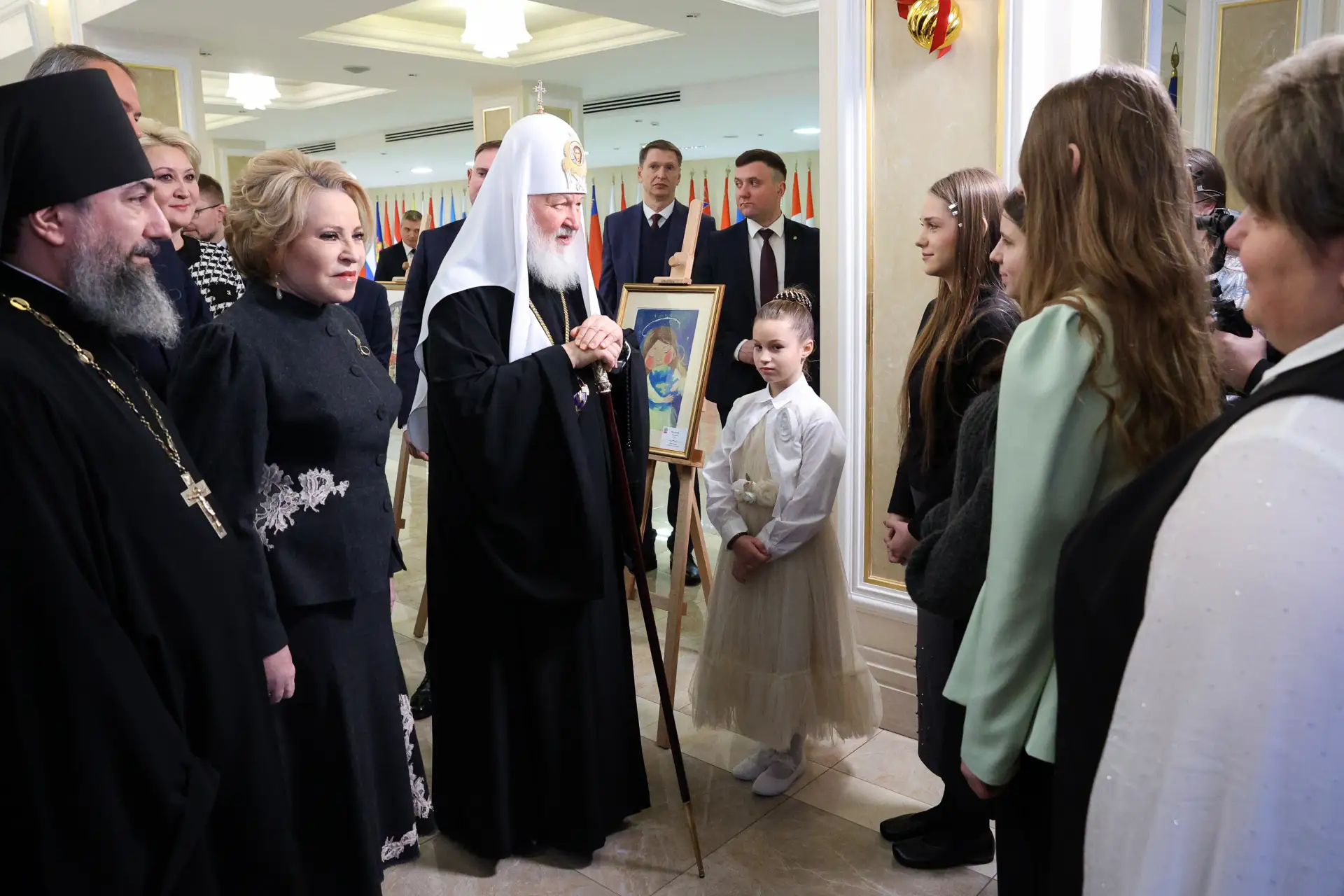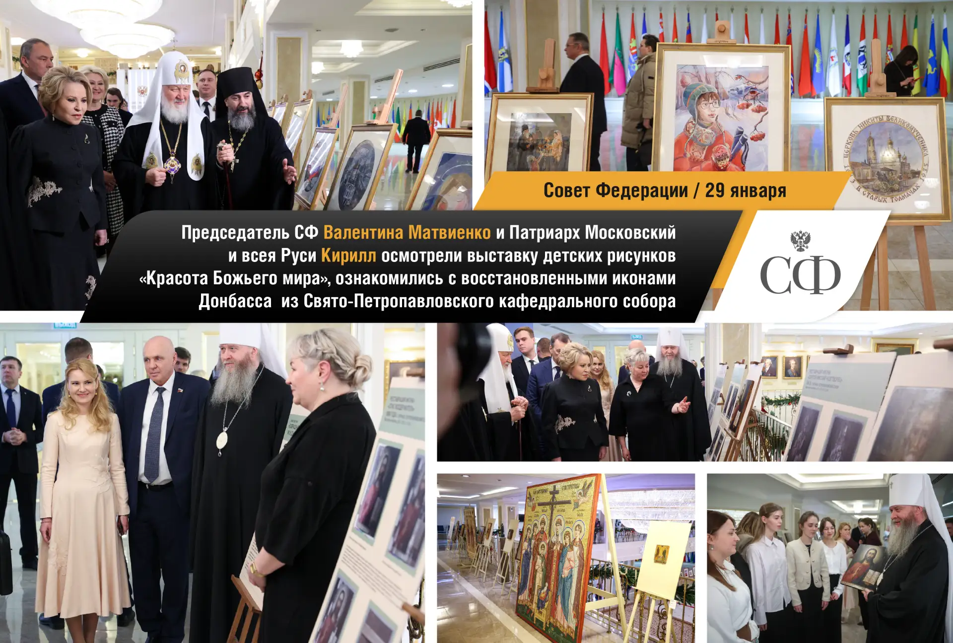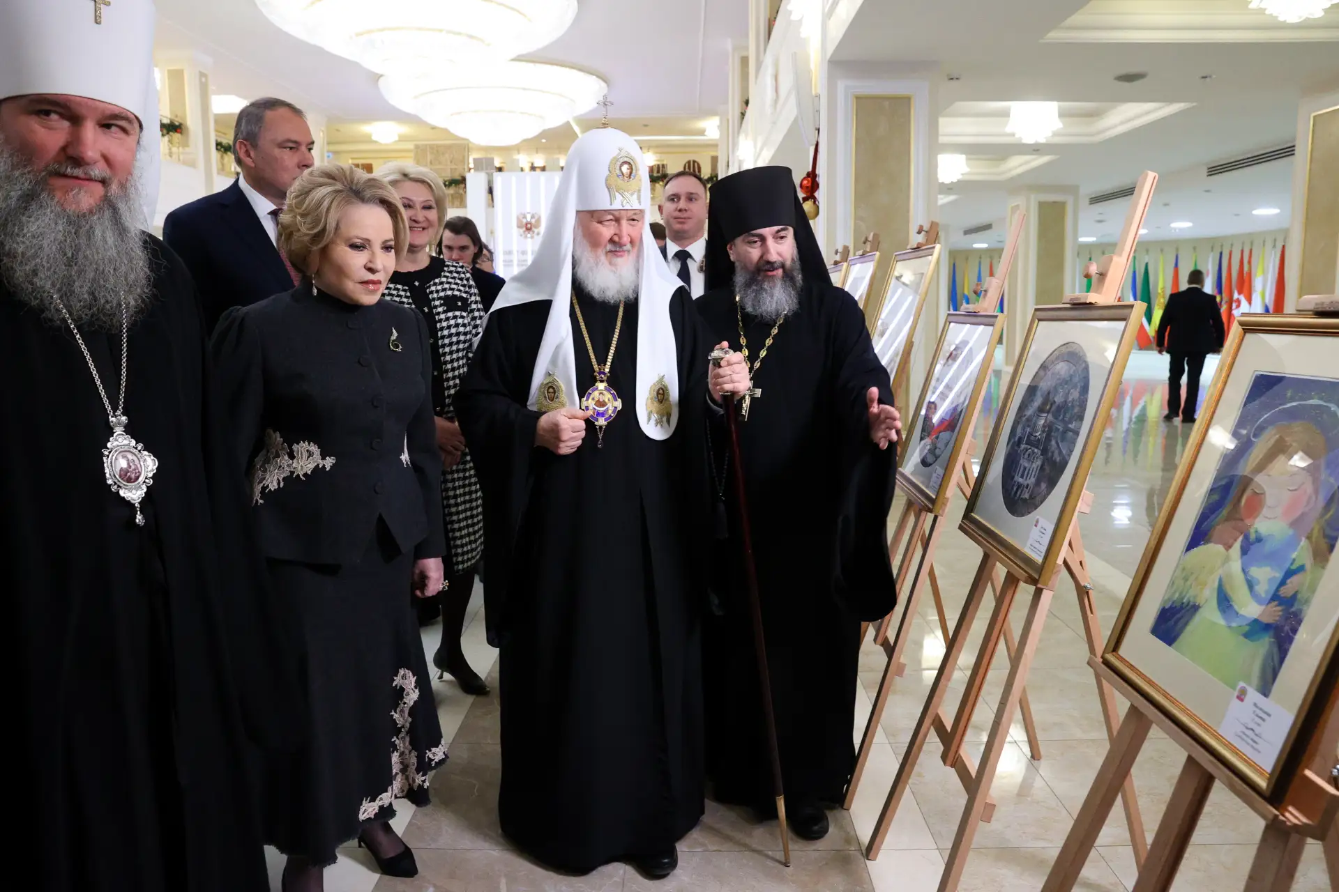 Председатель Совета Федерации Валентина Матвиенко и Святейший Патриарх Московский и всея Руси Кирилл осмотрели выставку детских рисунков «Красота Божьего мира», ознакомились с экспонатами Музея Русского Патриаршества на экспозиции «Люди Церкви: история одного рода» и восстановленными иконами Донбасса из Свято-Петропавловского кафедрального собора.