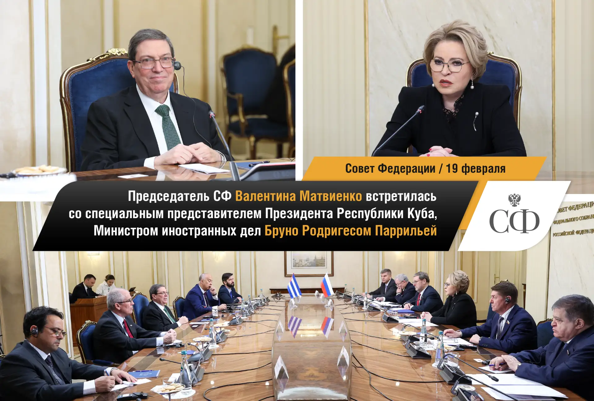 🇷🇺🇨🇺 Председатель Совета Федерации Валентина Матвиенко провела встречу со специальным представителем Президента Республики Куба, Министром иностранных дел Бруно Родригесом Паррильей. Спикер СФ заявила, что Куба — важнейший стратегический партнёр и давний друг нашей страны. По её словам, Совет Федерации ежегодно принимает заявление о необходимости прекращения экономической, торговой и финансовой блокады, введённой США против Кубы.