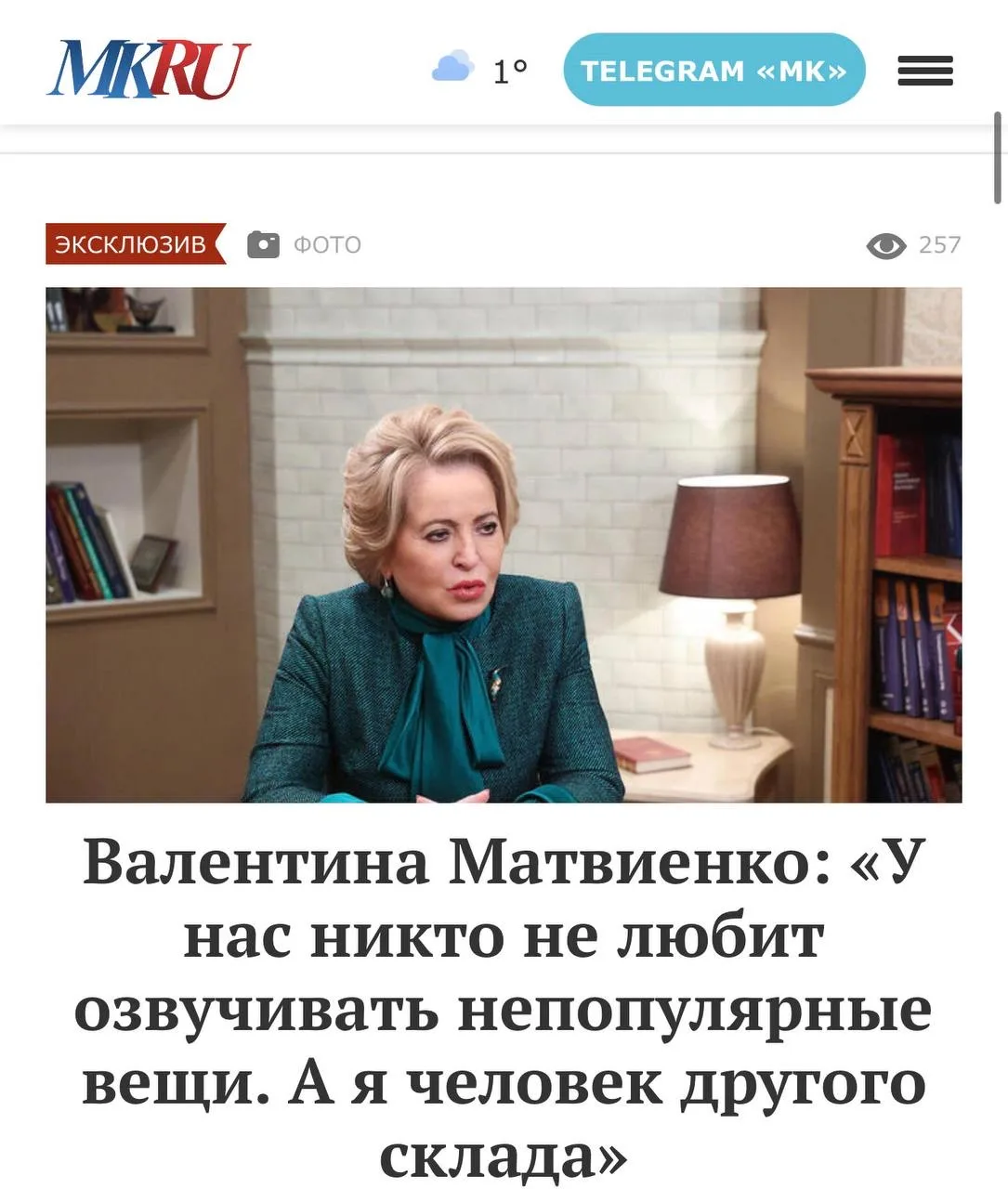 Большое интервью Председателя Совета Федерации Валентины Матвиенко изданию «МК»: «У нас никто не любит озвучивать непопулярные вещи. А я человек другого склада».