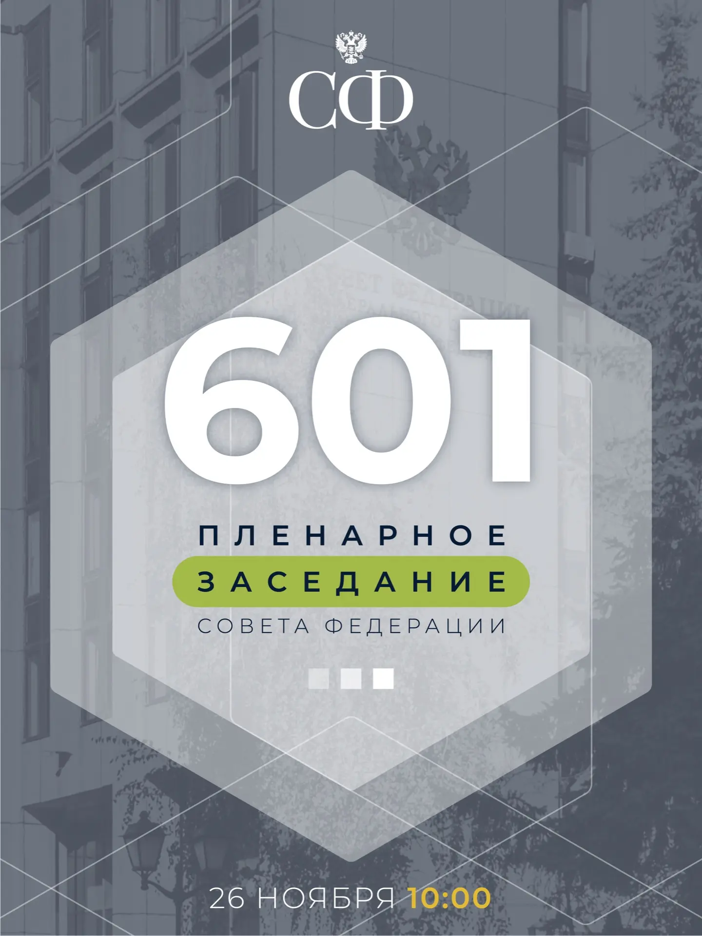 26 ноября в 10:00 состоится 601-е пленарное заседание Совета Федерации