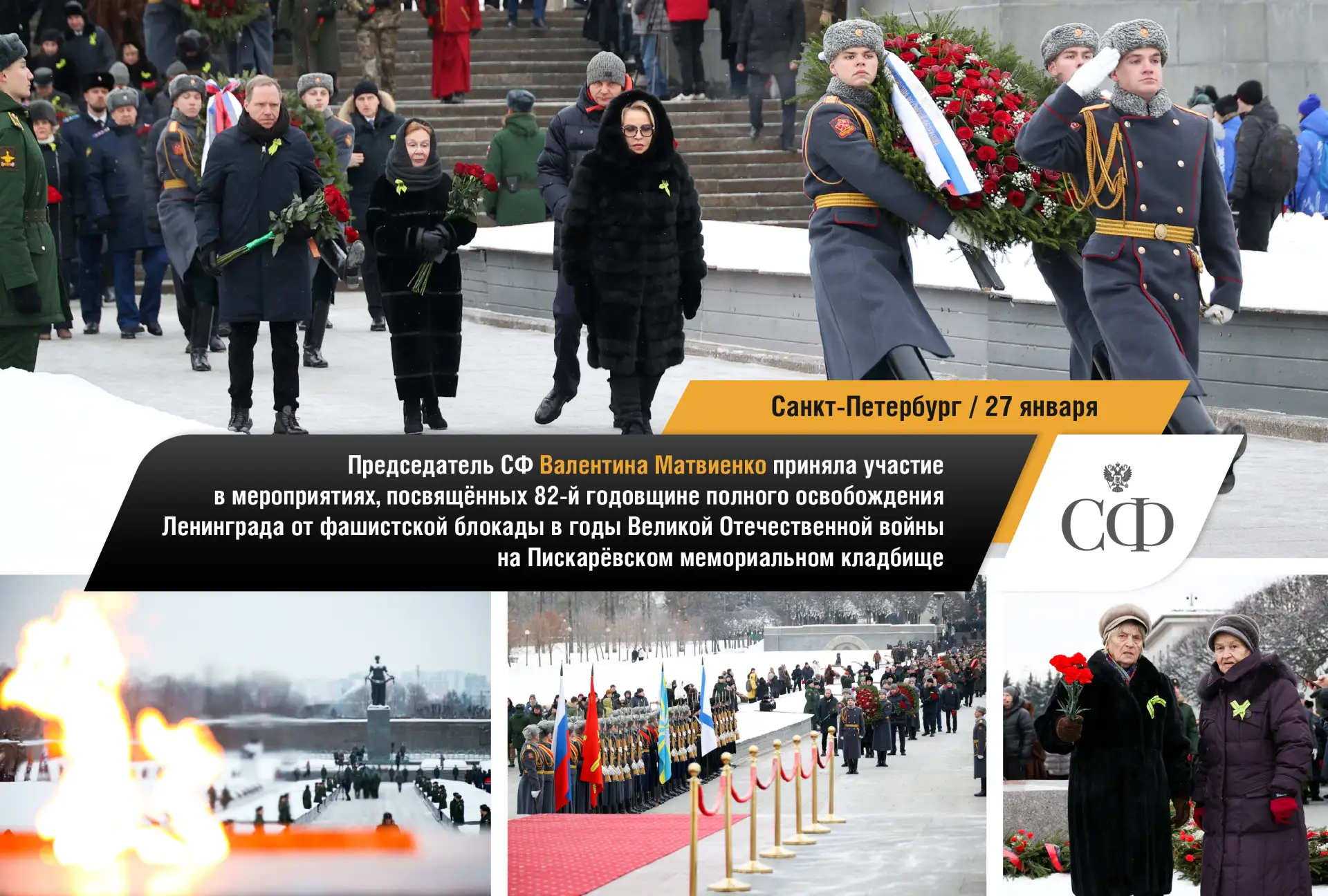 🔹 Председатель Совета Федерации Валентина Матвиенко приняла участие в мероприятиях, посвящённых 82-й годовщине полного освобождения Ленинграда от фашистской блокады в годы Великой Отечественной войны. Спикер СФ в беседе с журналистами напомнила, что в этом году 8 сентября исполняется 85 лет со дня начала фашистской блокады. По её мнению, это повод говорить о ленинградской трагедии. Она заявила о подготовке соответствующего обращения ко всем парламентам мира.