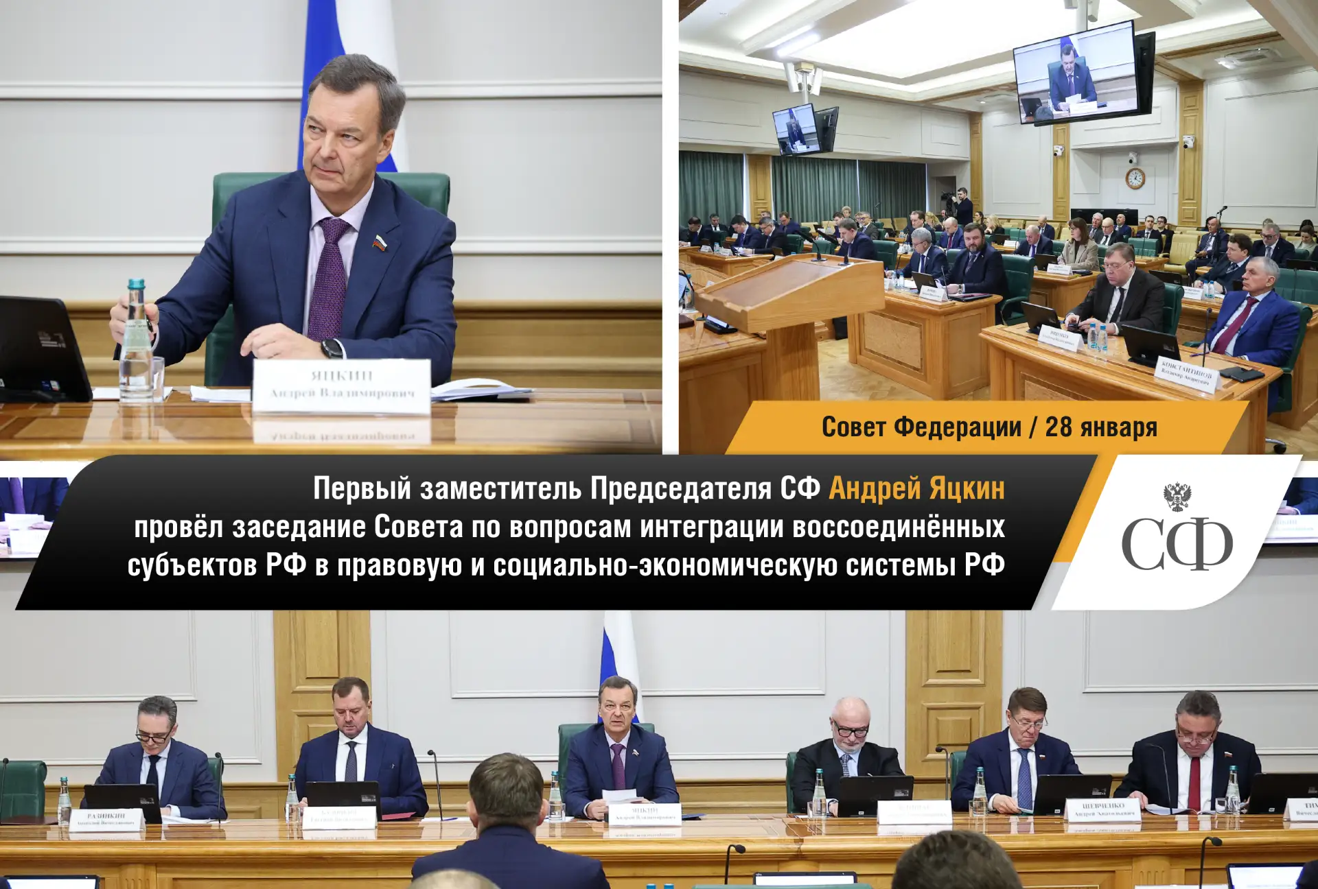 🔹 В верхней палате состоялось заседание Совета по вопросам интеграции воссоединённых субъектов РФ в правовую и социально-экономическую системы РФ, которое провёл первый вице-спикер СФ Андрей Яцкин.