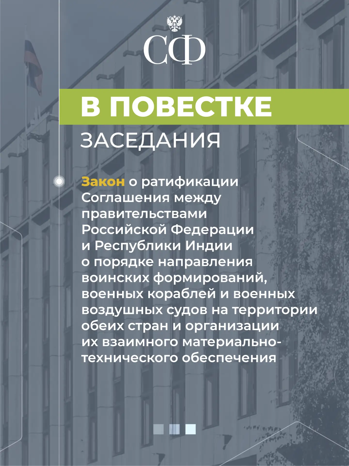 ▪️ о ратификации Соглашения между правительствами Российской Федерации и Республики Индии о порядке направления воинских формирований, военных кораблей и военных воздушных судов на территории обеих стран и организации их взаимного материально-технического обеспечения,