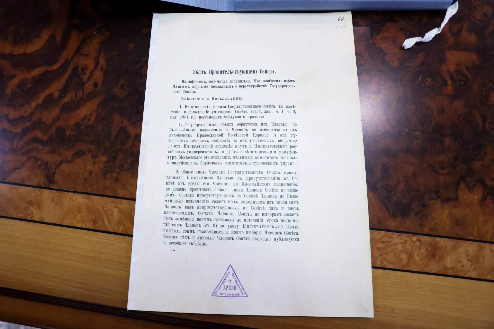 Андрей Артизов представил печатный подлинник Указа 1906 года, согласно которому Государственный Совет стал верхней палатой российского парламента.