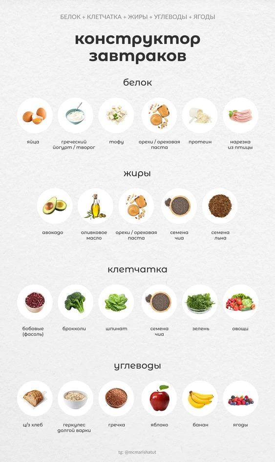 Правильный завтрак — это белок + сложные углеводы + жиры + клетчатка. Из этих четырёх блоков можно собрать сотни вариантов, не надоедая себе. Белок: яйца, творог, греческий йогурт, протеин. Углеводы: овсянка, гречка, цельнозерновой хлеб, киноа. Жиры: орехи, авокадо, сливочное масло. Клетчатка: ягоды, овощи, зелень.