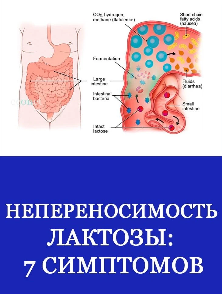 Лактоза — молочный сахар. Если в тонком кишечнике не хватает фермента лактазы, непереваренная лактоза идёт дальше. В толстом кишечнике её атакуют бактерии, запуская брожение с выделением углекислого газа, водорода и метана — отсюда вздутие и газы.