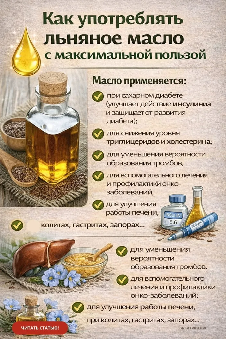 Льняное масло — рекордсмен по содержанию омега-3 среди растительных масел. Оно улучшает действие инсулина при диабете, снижает триглицериды и холестерин, уменьшает риск тромбов. Используется для вспомогательной терапии при онкозаболеваниях и для улучшения работы печени.