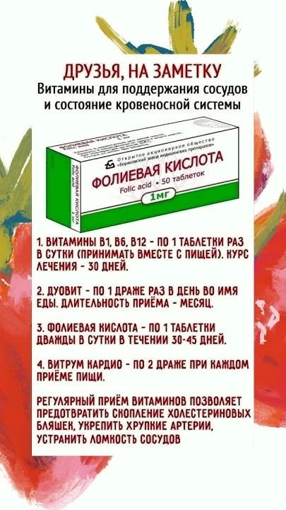 Для сосудов нужен комплекс, а не один витамин. Витамины В1, В6, В12 снижают гомоцистеин — аминокислоту, которая повреждает стенки сосудов и ведёт к атеросклерозу. Фолиевая кислота работает в паре с ними, особенно при планировании беременности и для сердца. Дуовит даёт базовый набор витаминов и минералов. Витрум Кардио — специальный комплекс с омега-3, коэнзимом Q10 и магнием для сердечно-сосудистой системы.