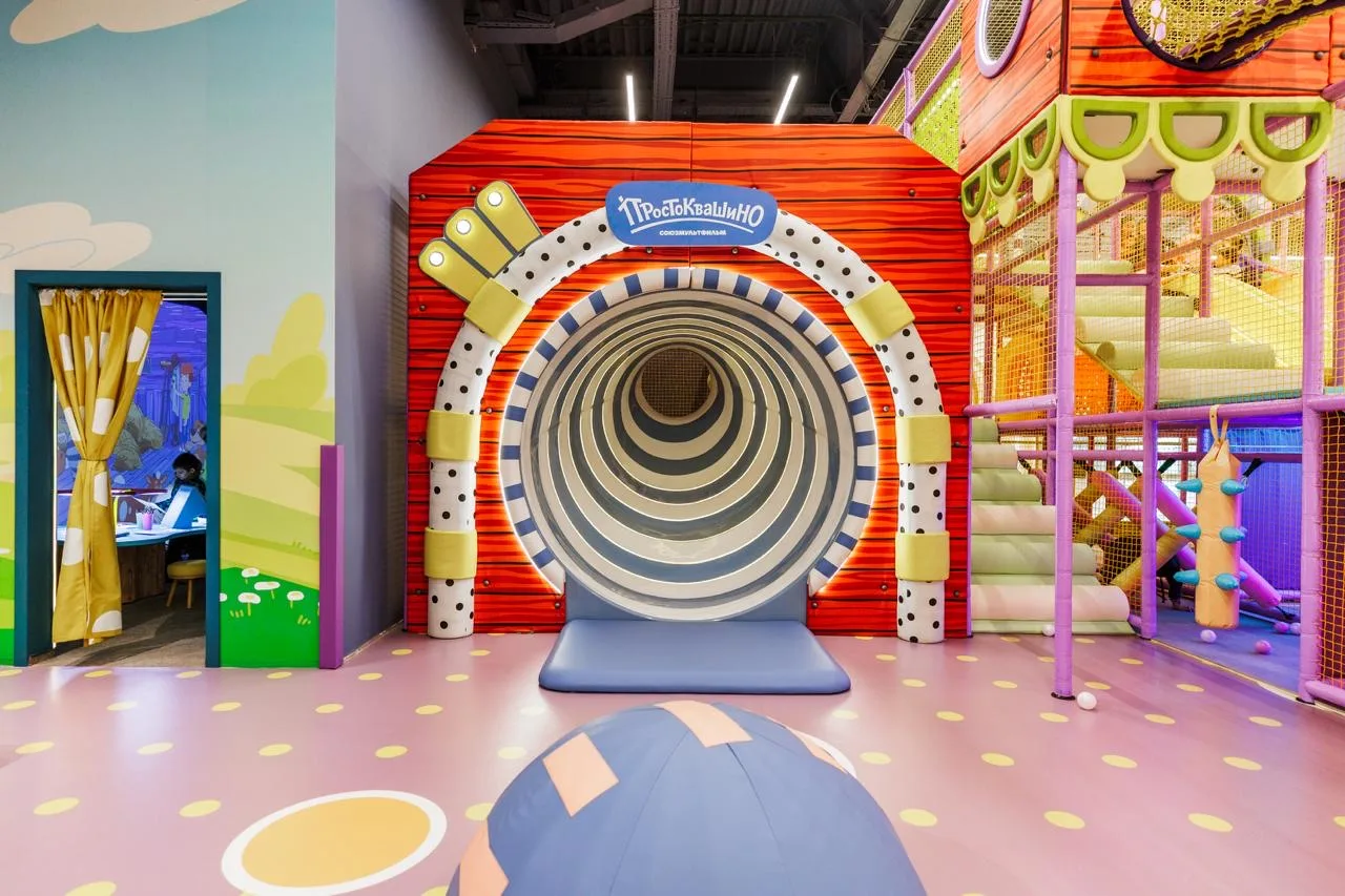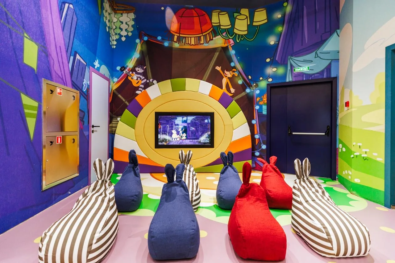 Для юных гостей оборудована большая игровая зона — сухой бассейн, горки, карусель, домик «Почта», а также мини-кинотеатр, где показывают мультфильмы.