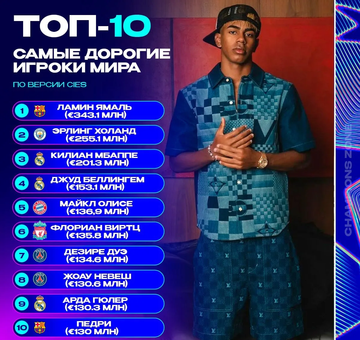 🔝 Ямаль за 343 млн евро – самый дорогой игрок мира по версии CIES