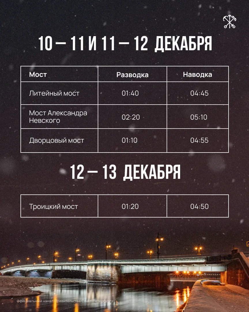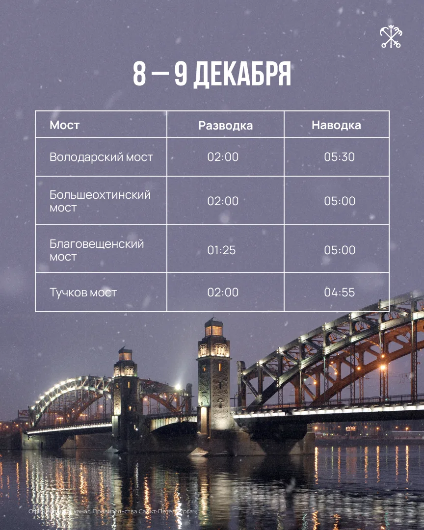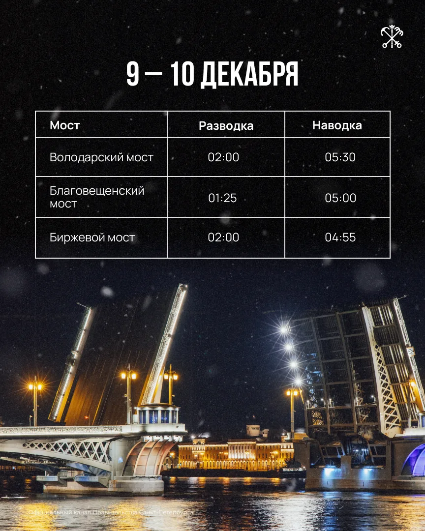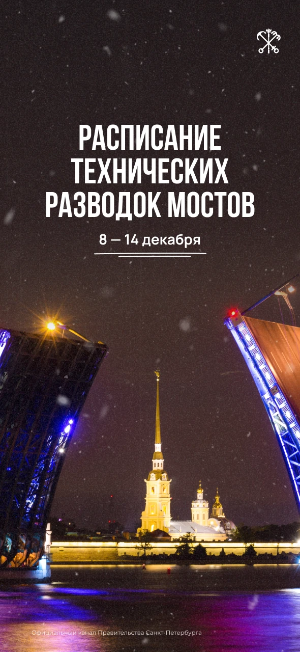 График разводок — в наших карточках. Также следить за расписанием можно на сайте и в приложении «Мосты Петербурга».