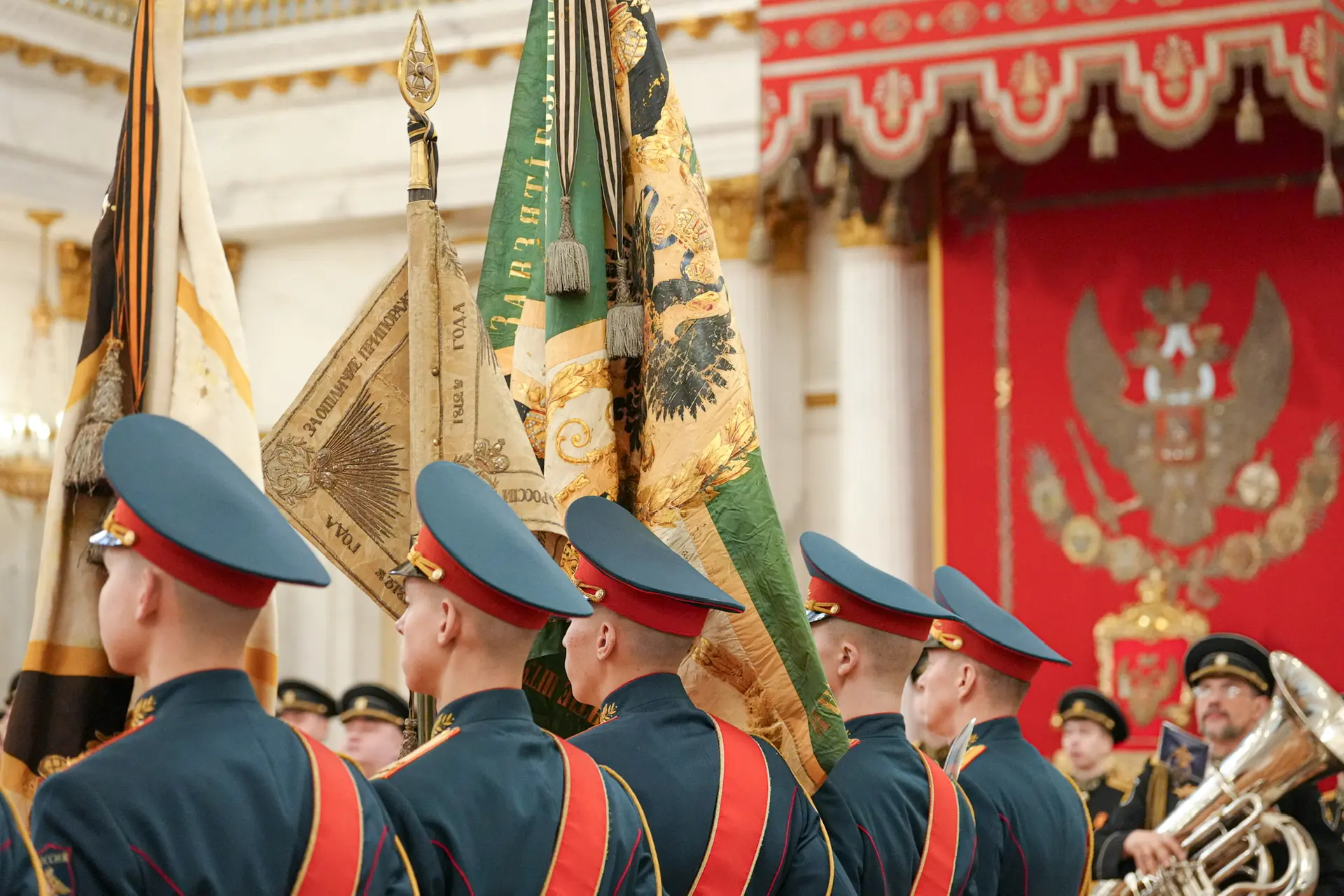 Сегодня возложили цветы к обелиску «Городу-Герою Ленинграду» на площади Восстания. В Эрмитаже прошла, уже ставшая традиционной, торжественная церемония выноса знамён и штандартов Российской Императорской армии. Георгий Победоносец всегда был покровителем российских воинов.
