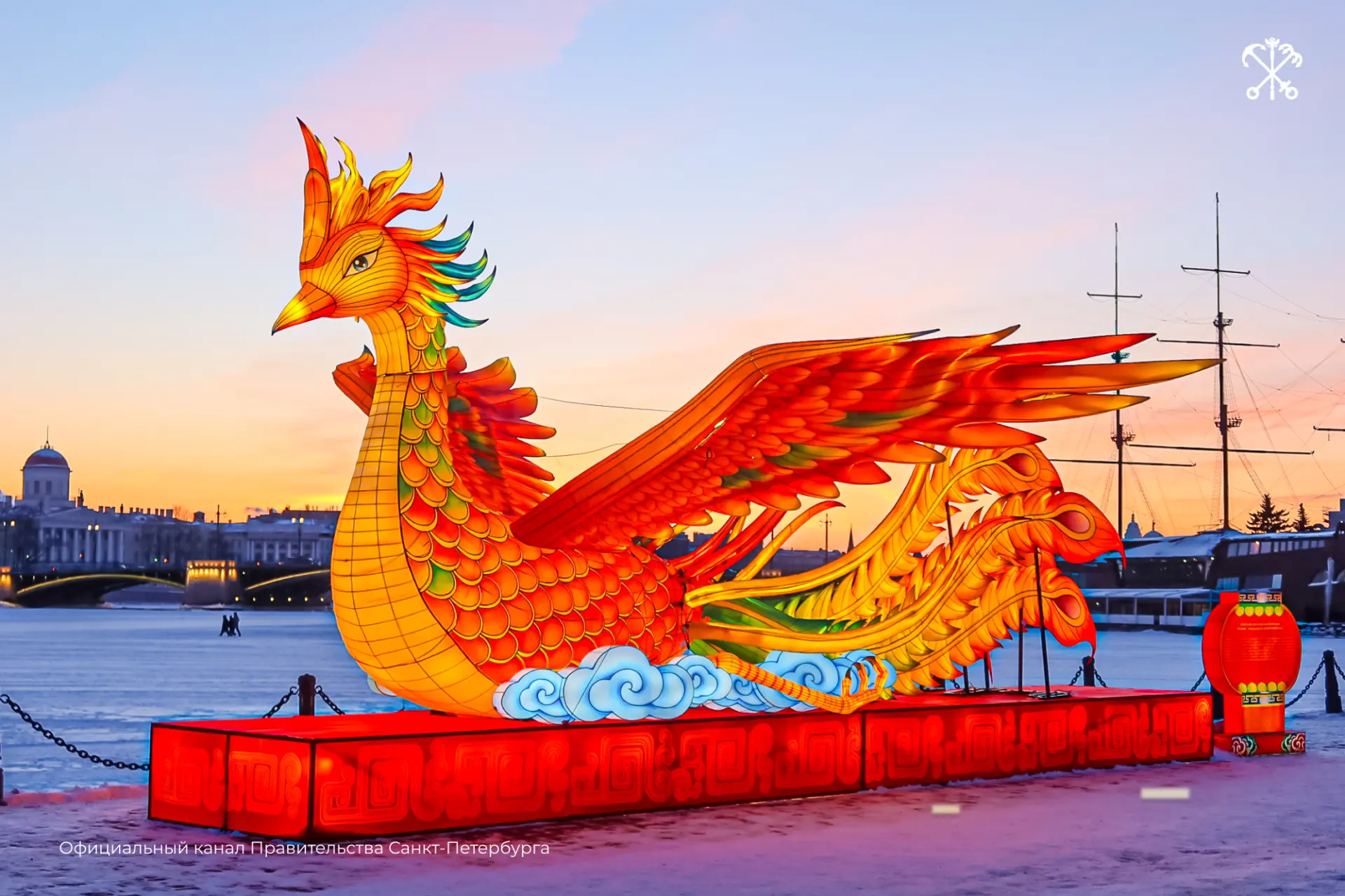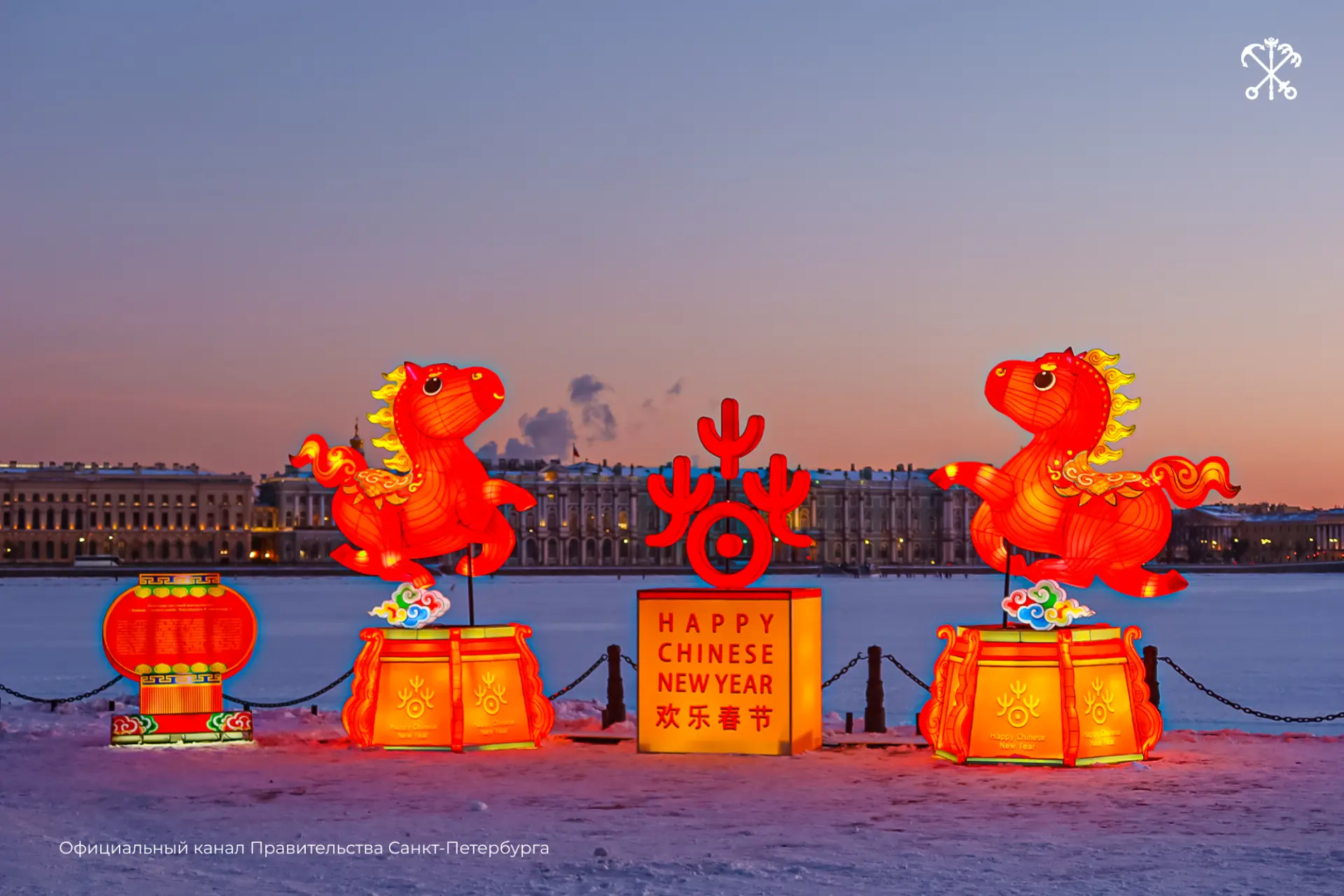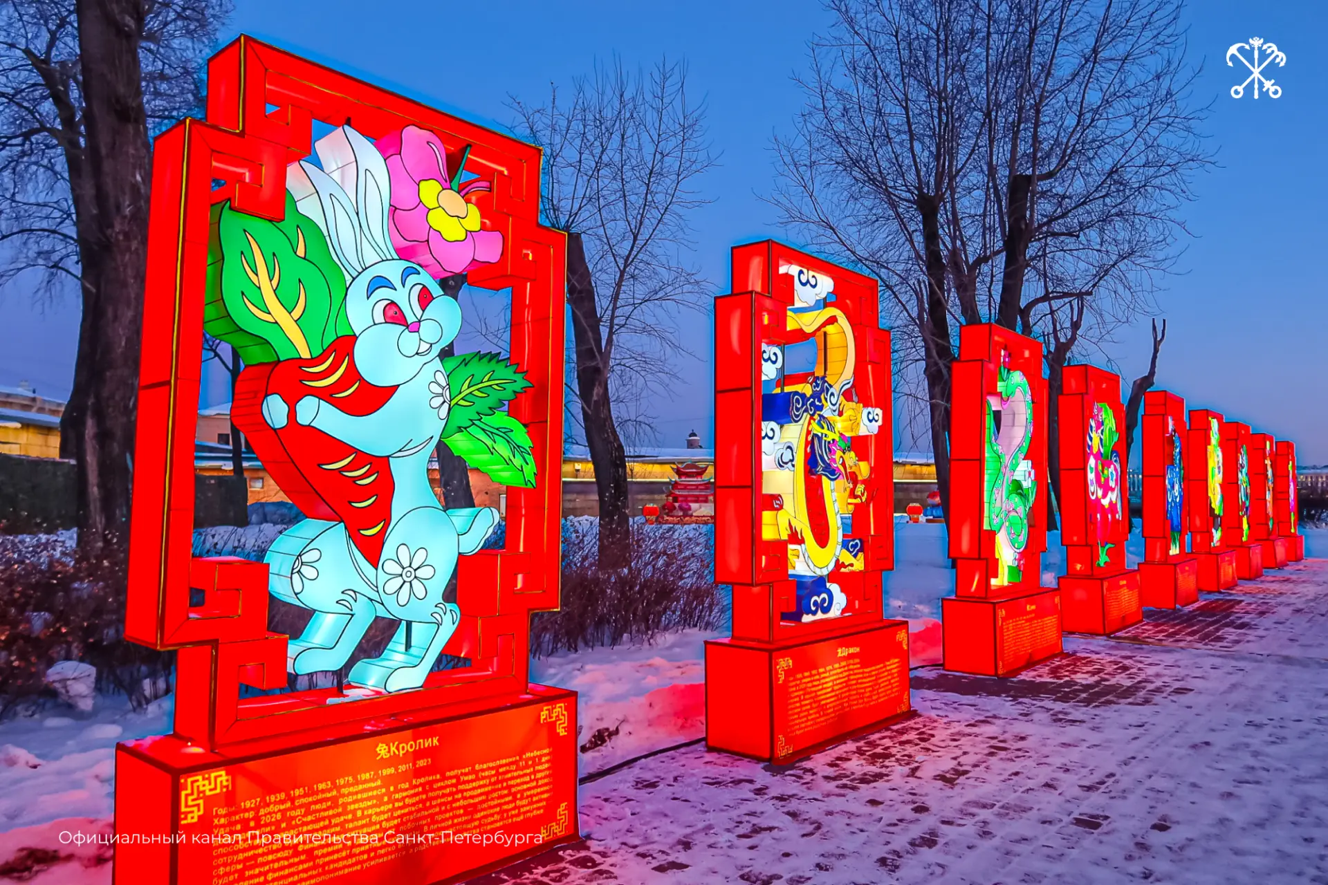 На стрелке Заячьего острова установили десять световых композиций. Их создали мастера из города Цзыгун провинции Сычуань — региона с многовековой традицией искусства фонарей. Инсталляции посвящены году Огненной Лошади.