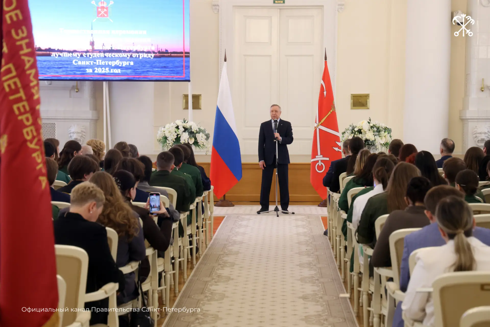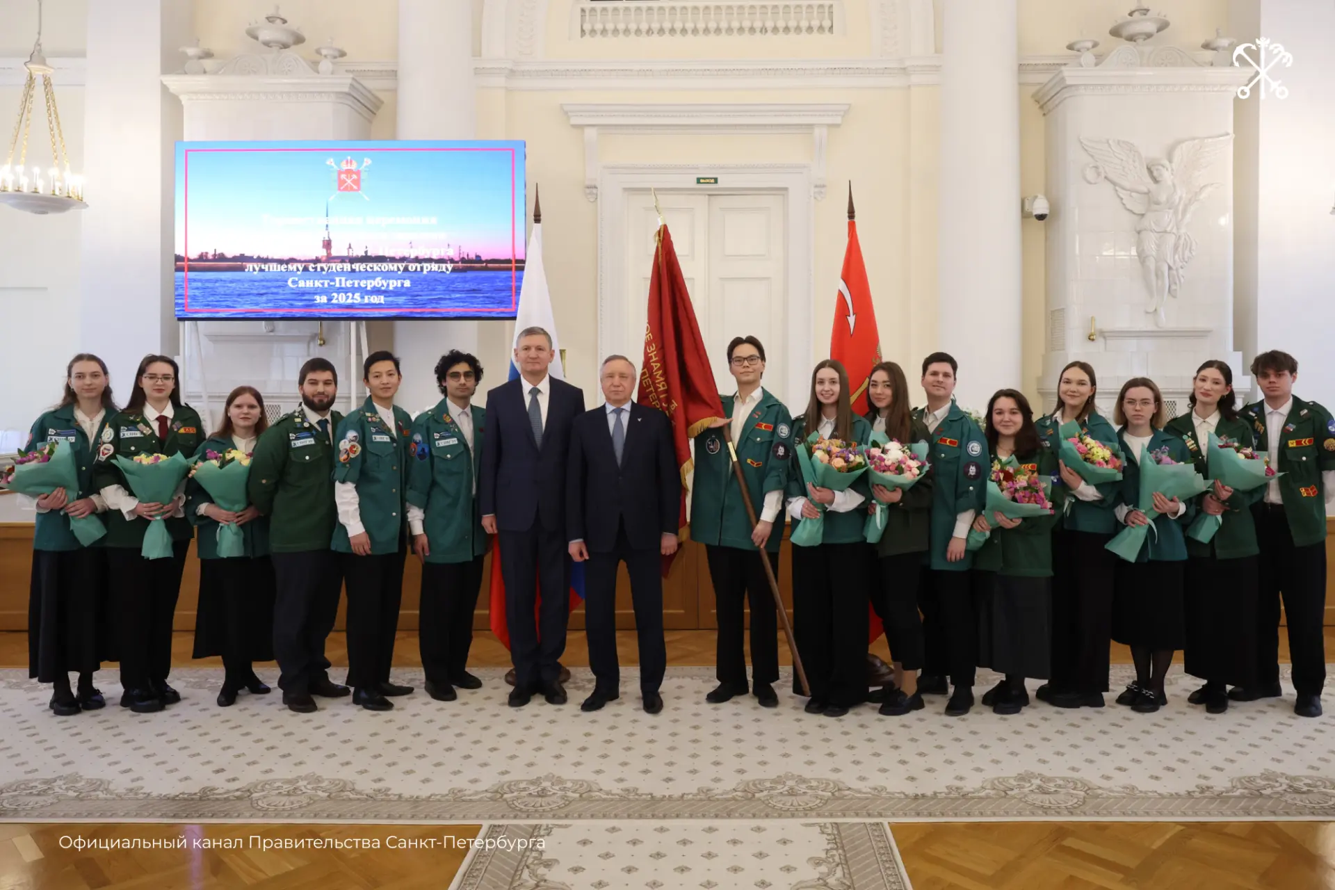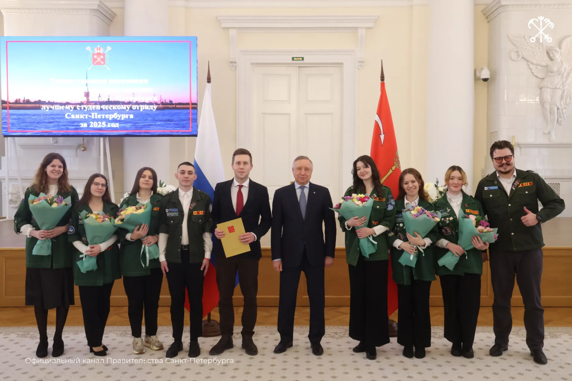В день государственного праздника Александр Беглов вручил Почётное знамя Губернатора Петербурга студотряду «Скиф» из СПбГЭУ — лучшему по трудовым заслугам в 2025 году.