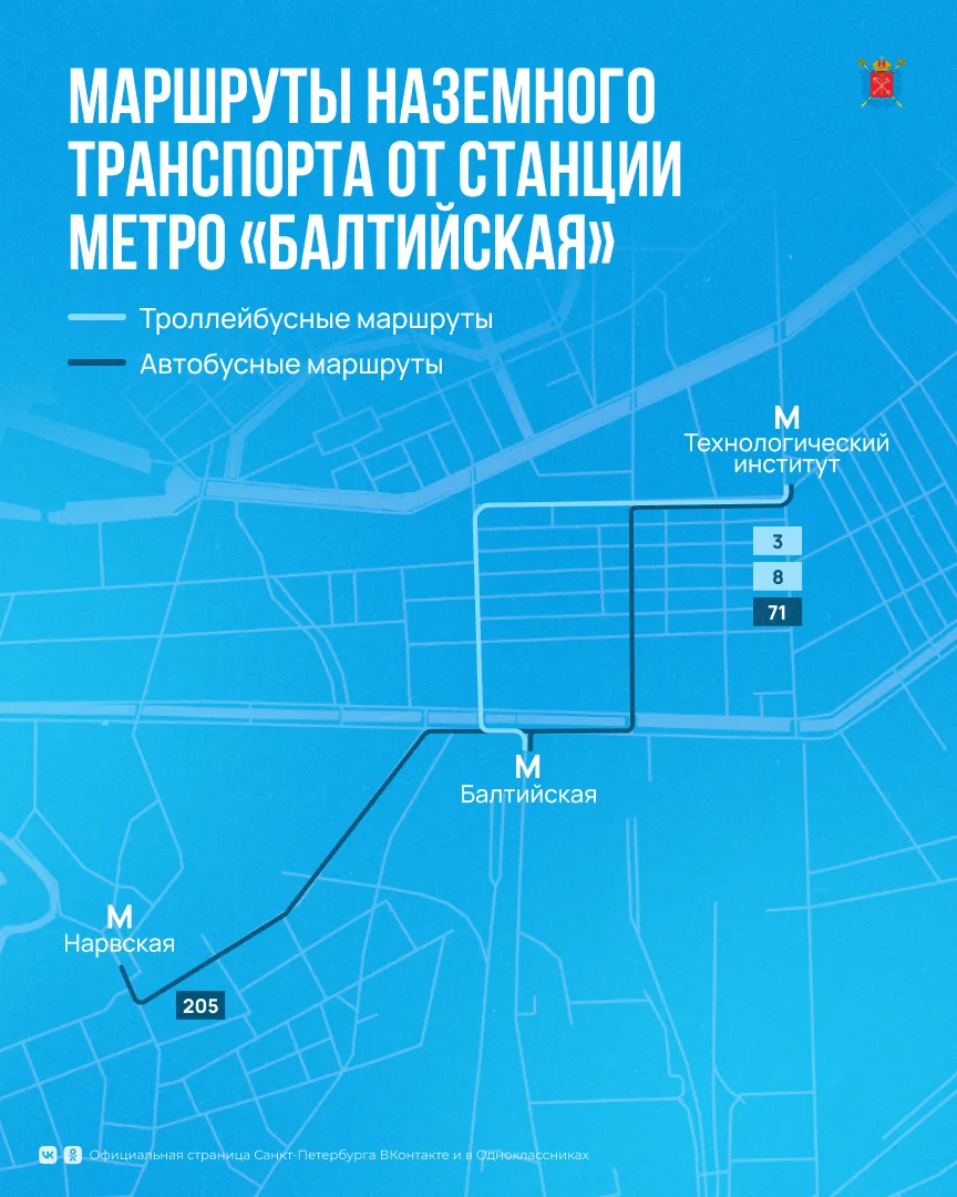 • до станции «Технологический институт» — автобус № 71, троллейбусы № 3 и № 8;