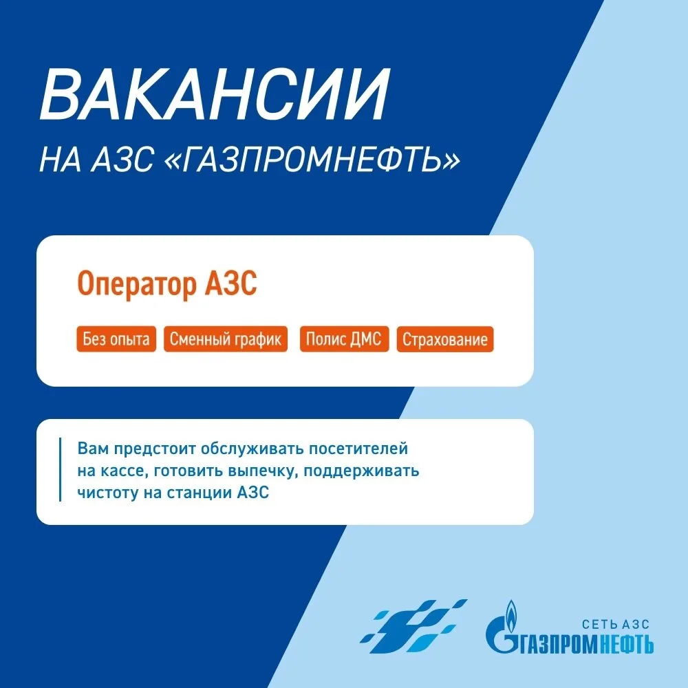 Сеть АЗС «Газпромнефть» приглашает на работу Операторов – кассиров АЗС. З/п: от 75 000 до 100 000 ₽.