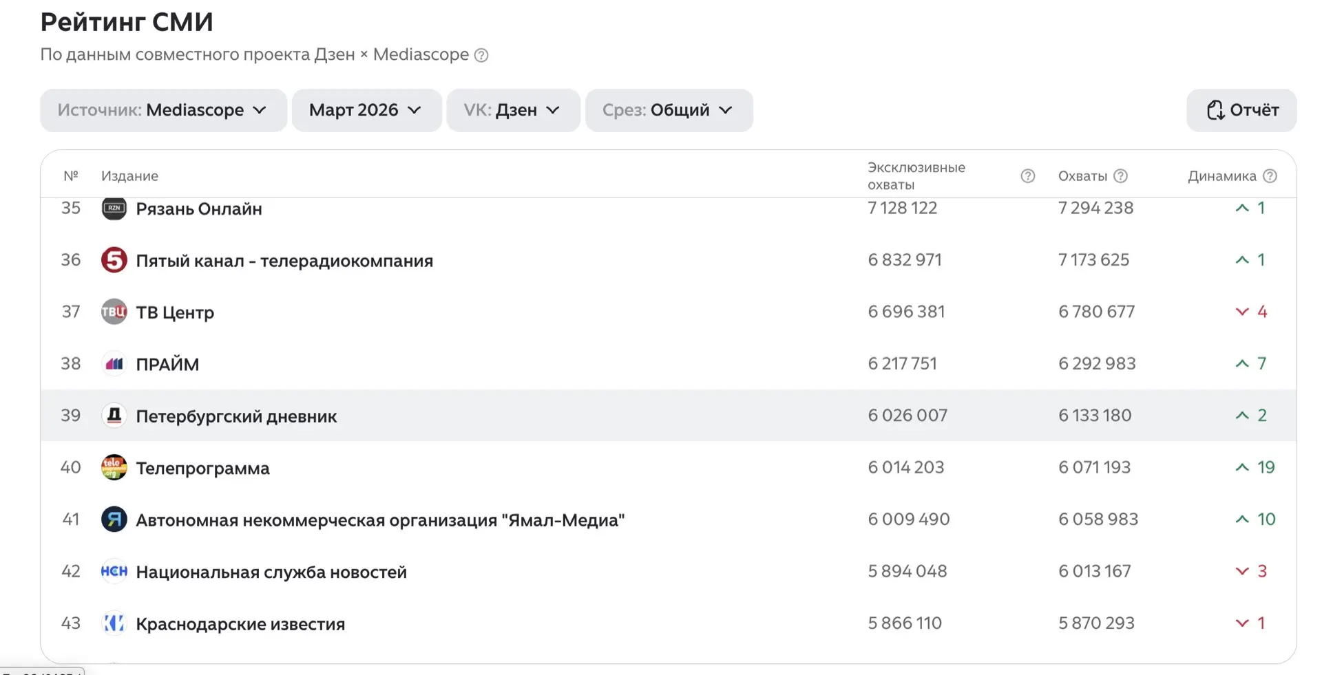 Опубликованы медиарейтинги за март 2026 года по данным Mediascope. В основе исследования — охват аудитории, цитируемость, число подписчиков и другие ключевые показатели.
