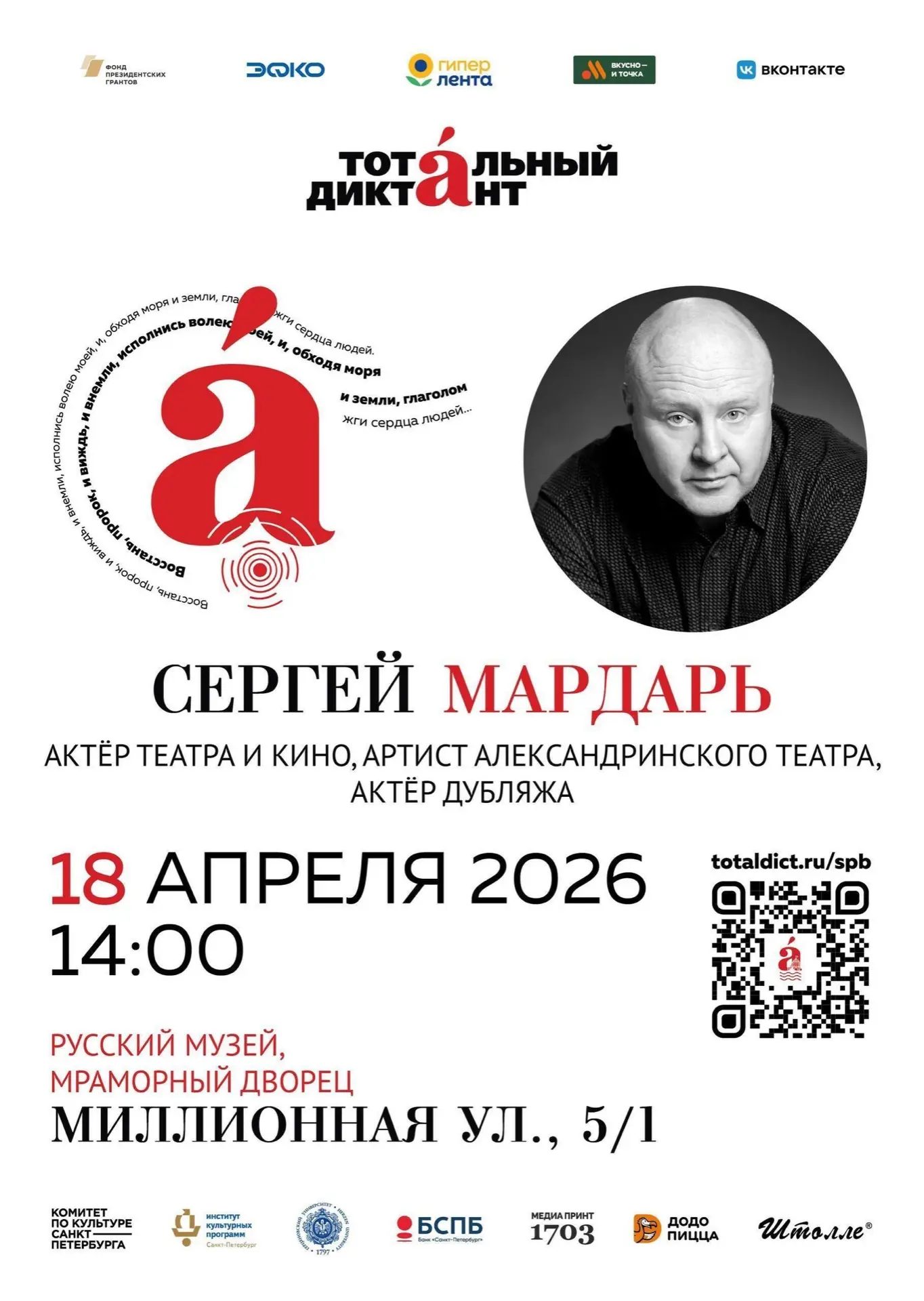 Регистрация на очное участие откроется 8 апреля в 7:00 на официальном сайте проекта. Чтецом на площадке выступит артист Александринского театра Сергей Мардарь, известный также по ролям в кино и озвучке популярных персонажей.