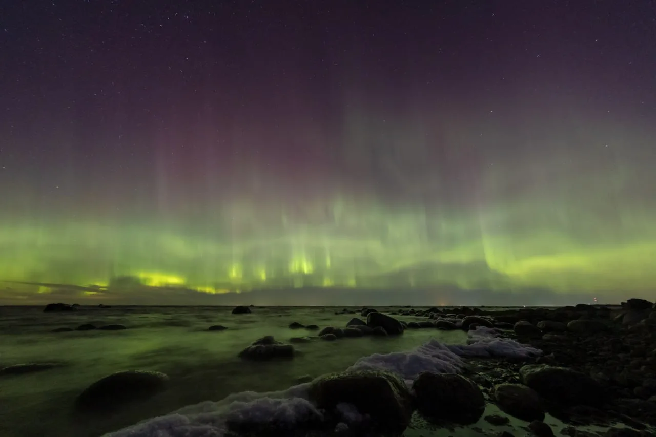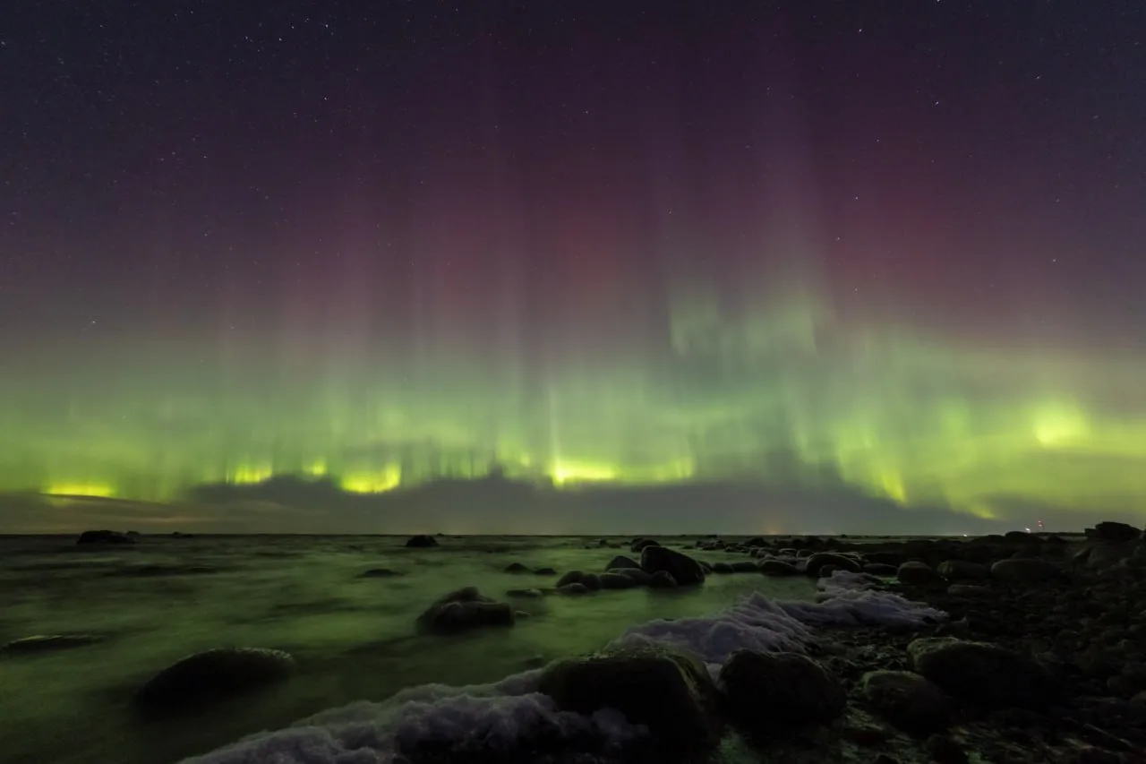 В Шепелево, на берегу Финского залива, сияние напоминало ажурные дюны, а после часа ночи небо заполыхало яркими огнями.