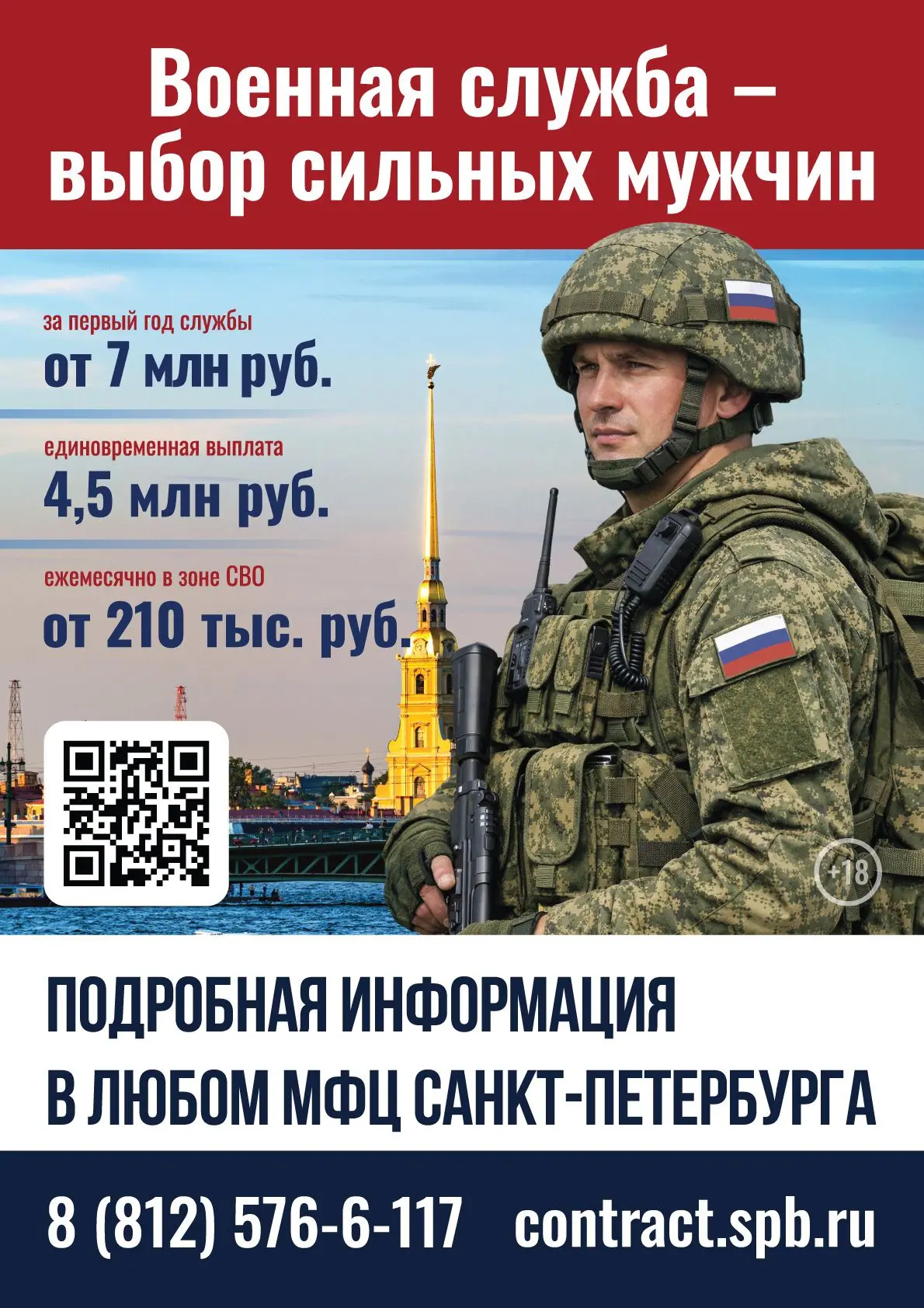 В Санкт‑Петербурге созданы все условия для заключения контракта на военную службу в Вооруженных Силах Российской Федерации. Размер выплаты в Санкт-Петербурге составит от 7 млн рублей в год, из них 4,5 млн рублей выплатят сразу после заключения контракта.